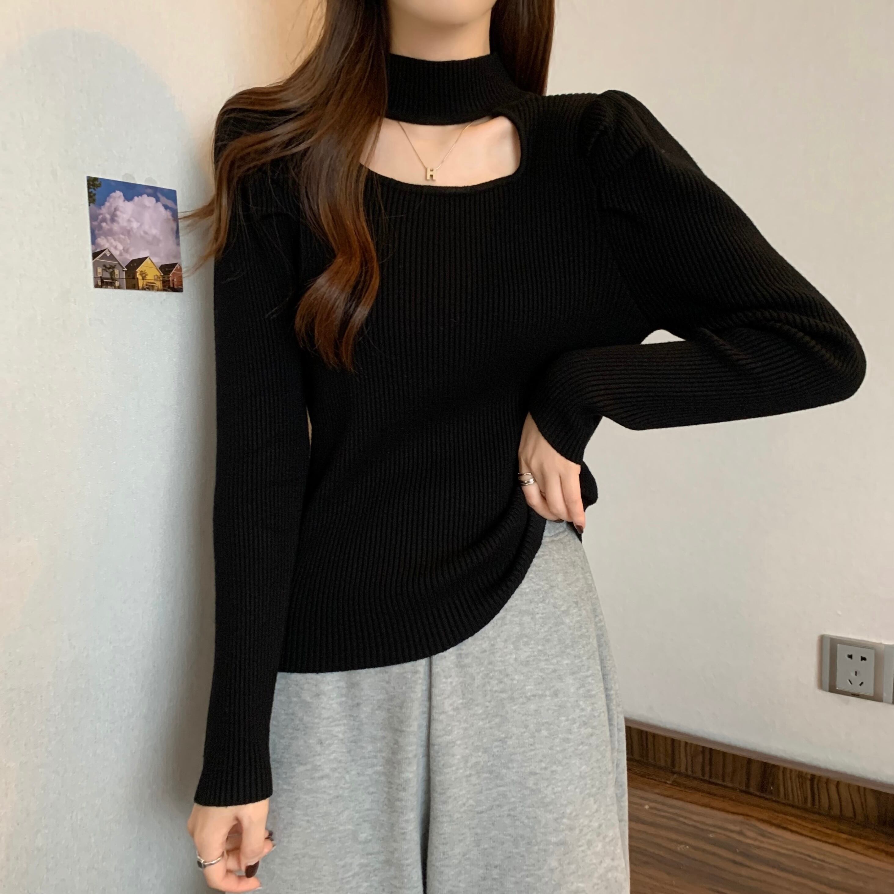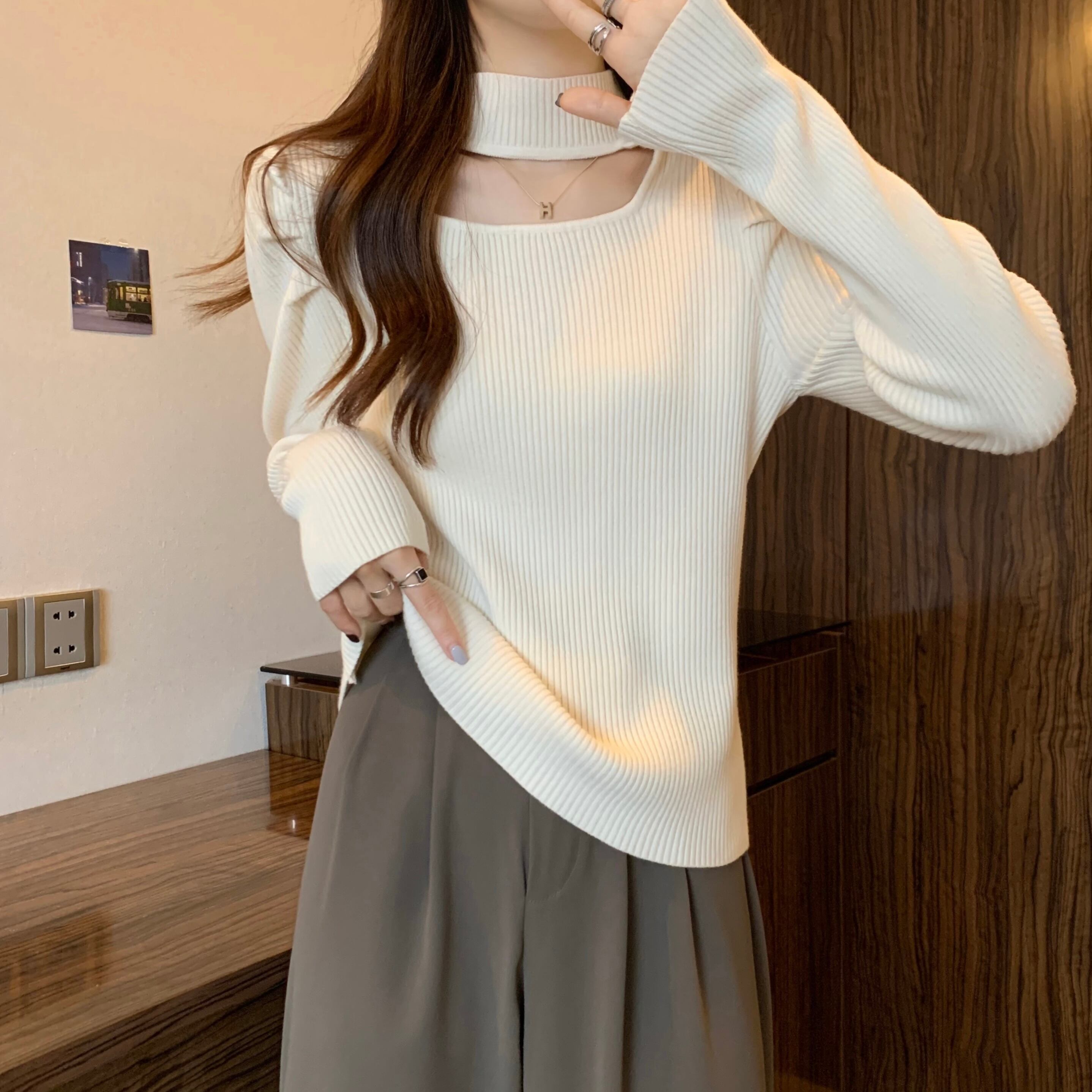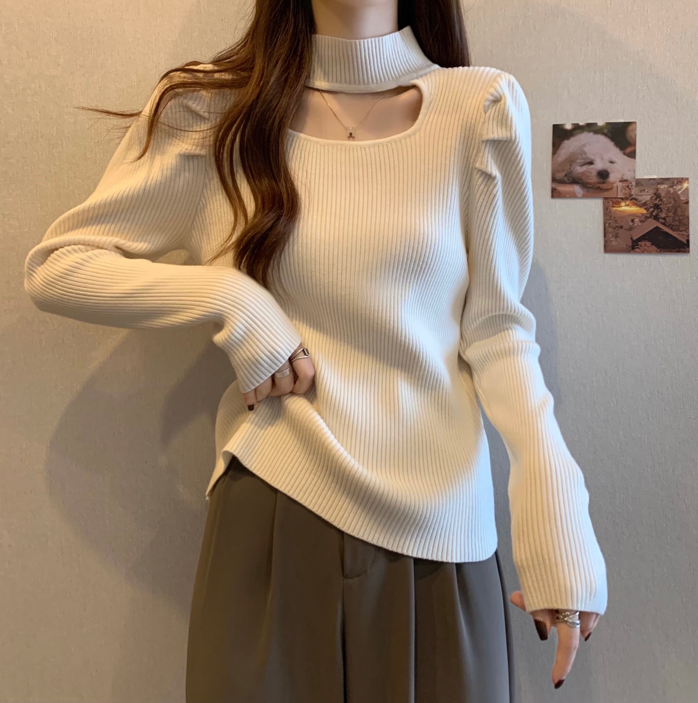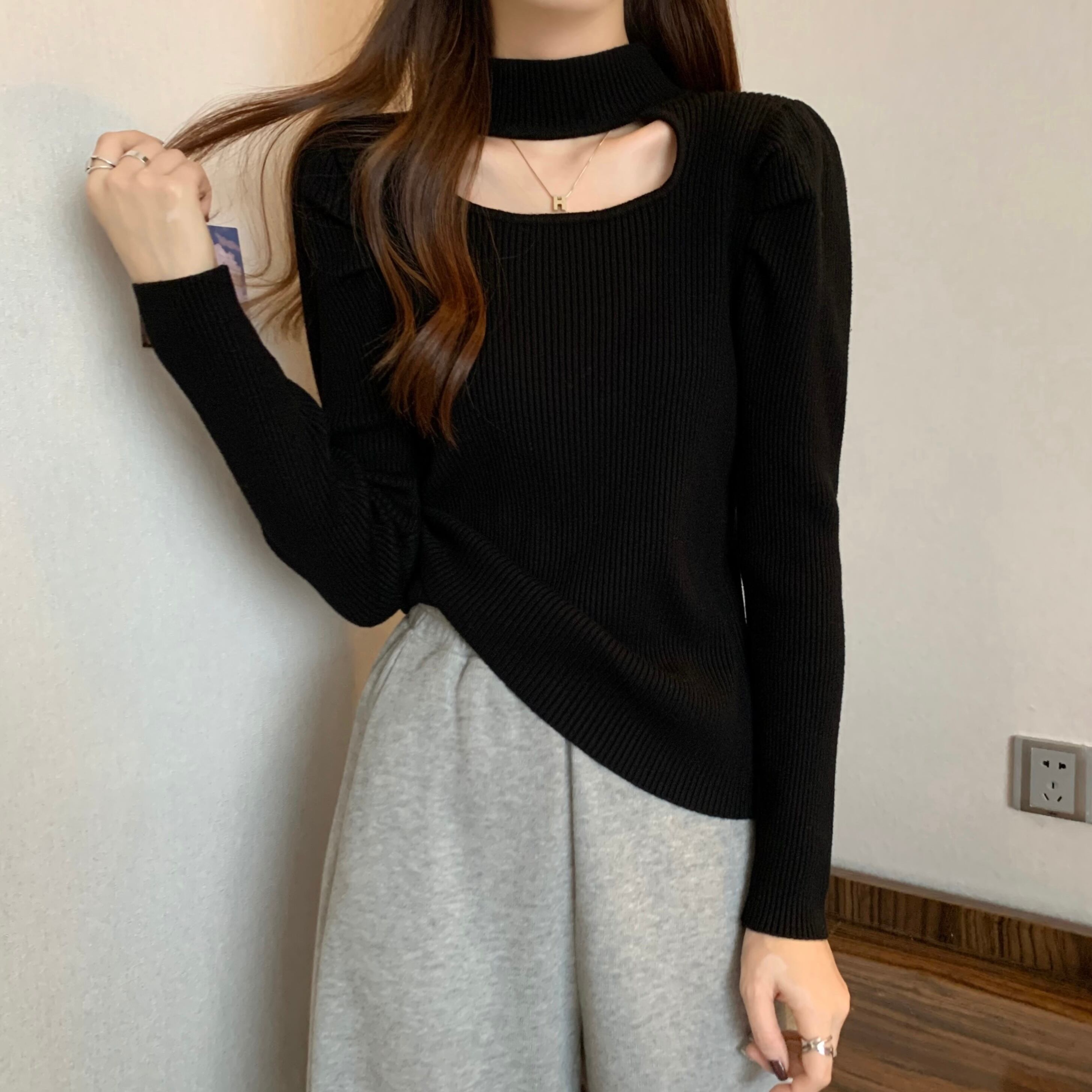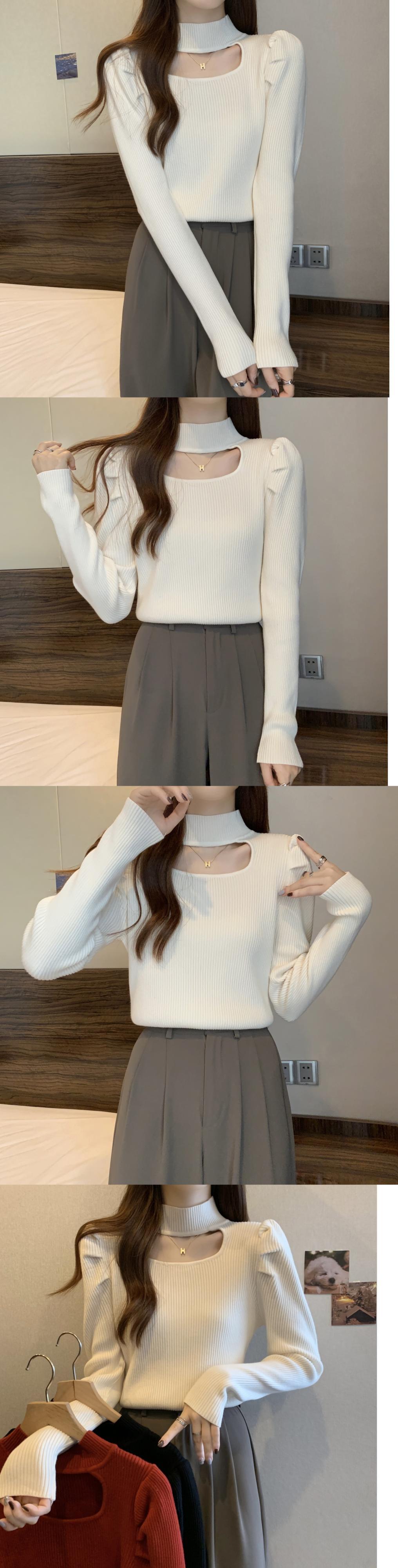 プラスサイズの婦人服 2023 ファットシスター春の新作ハーフハイカラー長袖ボトムシャツ中空アウト薄いニットトップ女性 ロング 大きめサイズ スプリング 春物 8884186244747281