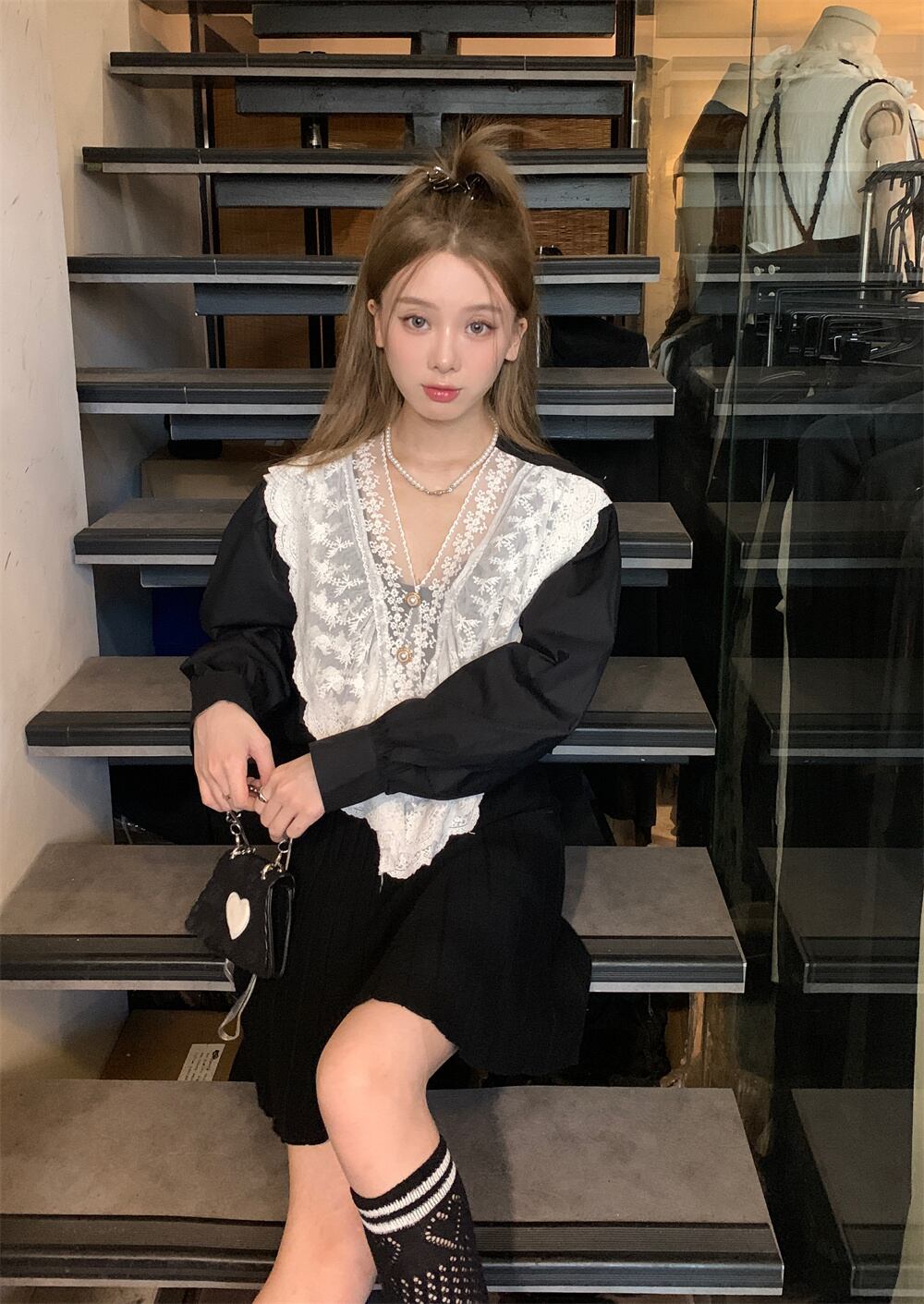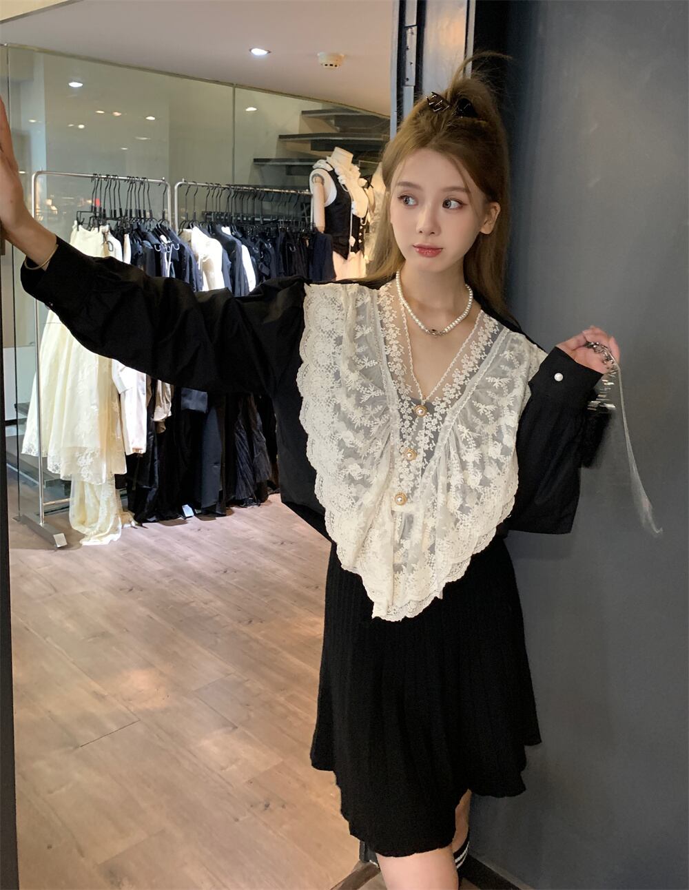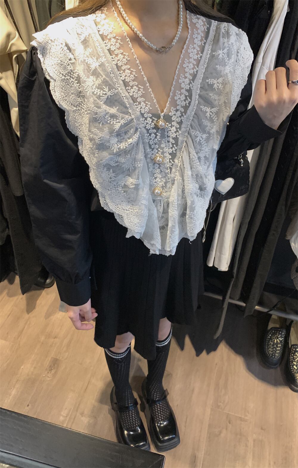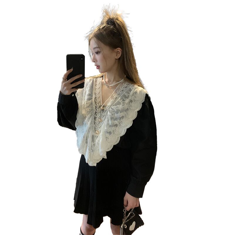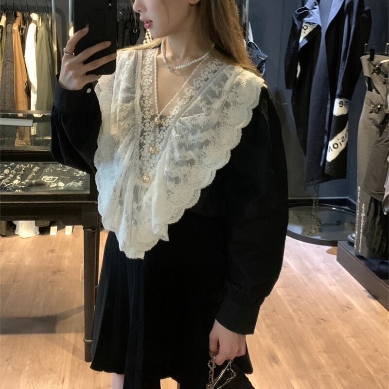 プラスサイズの婦人服 2023 ファットシスター春の新フリルレースステッチ v ネックシャツデザインセンストップス女性 大きめサイズ スプリング 春物 Vネック 8884145384539791