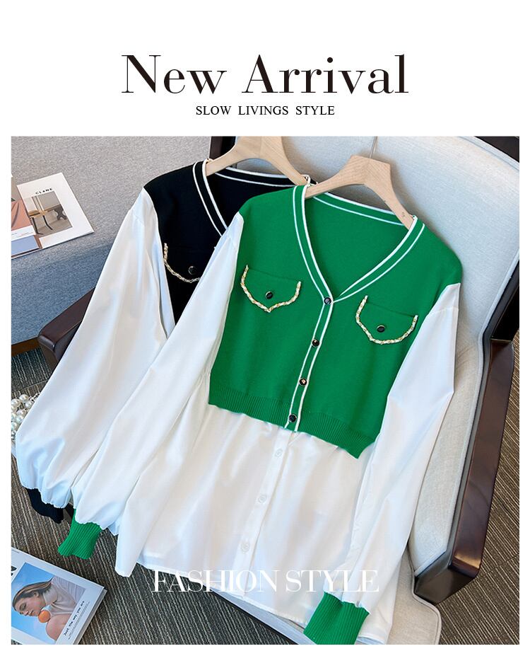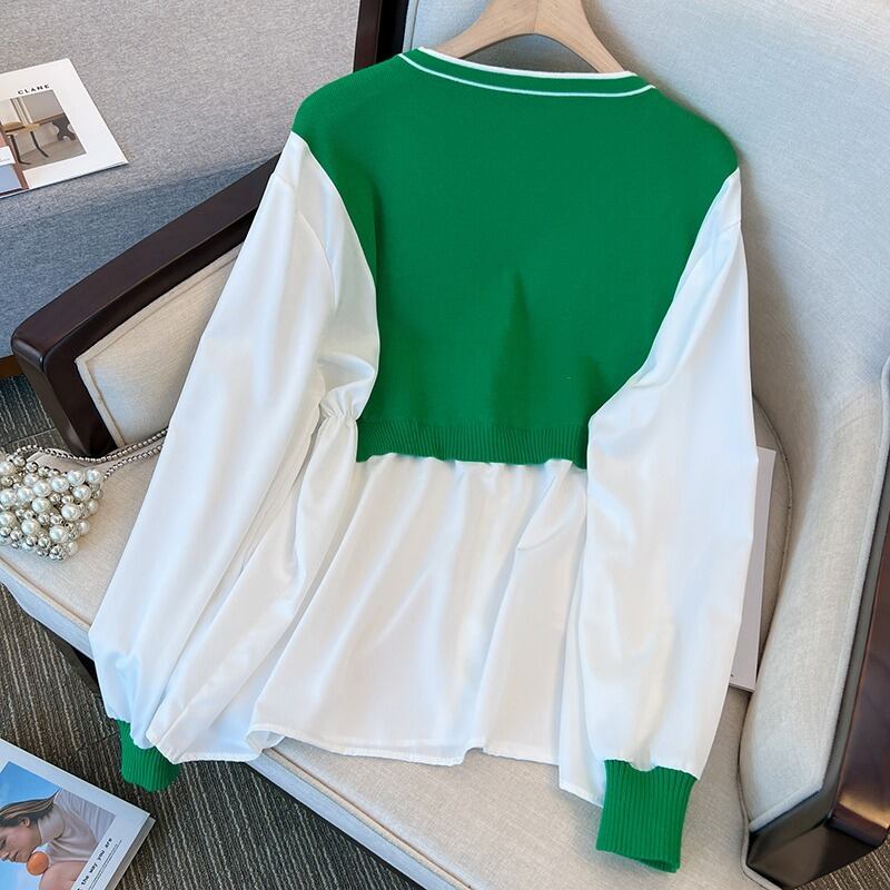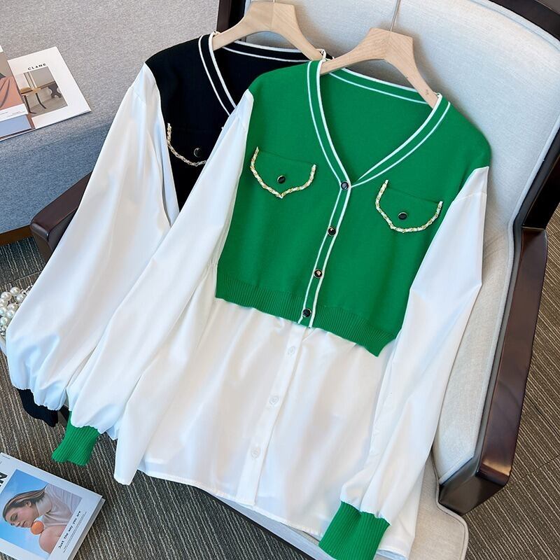 大きいサイズの婦人服 2023 トレンディな女性の春の新しい太った姉妹の年齢を減らすファッションのすべての試合の偽のツーピースのスプライシング ニット セーターのトレンド 大きめサイズ スプリング 春物 8884139724895187