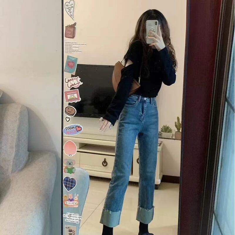 プラスサイズの婦人服 2023 脂肪姉妹春の新シンプルな弾性ズボンハイウエストストレートパンツ気質ジーンズ女性 ハイウェスト エラスティック 伸縮 大きめサイズ スプリング 春物 8884188098995790