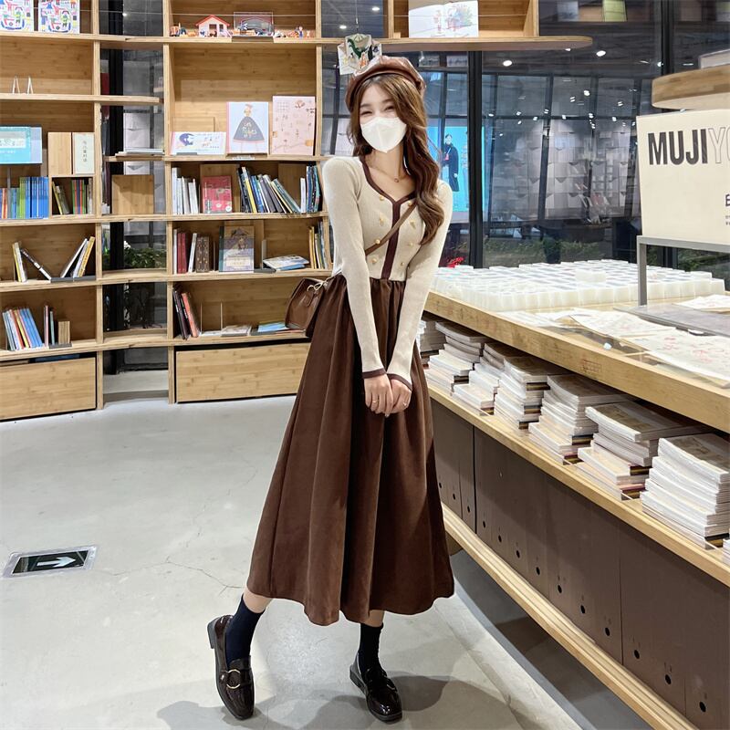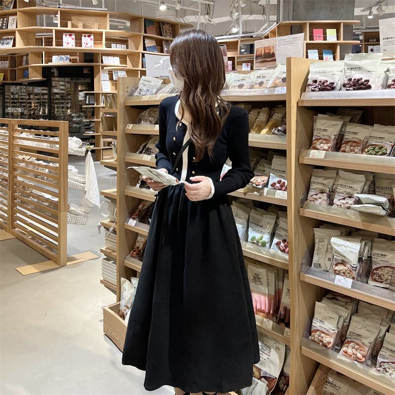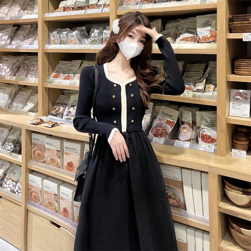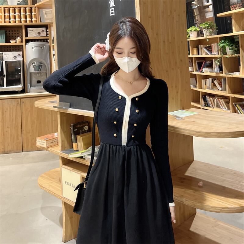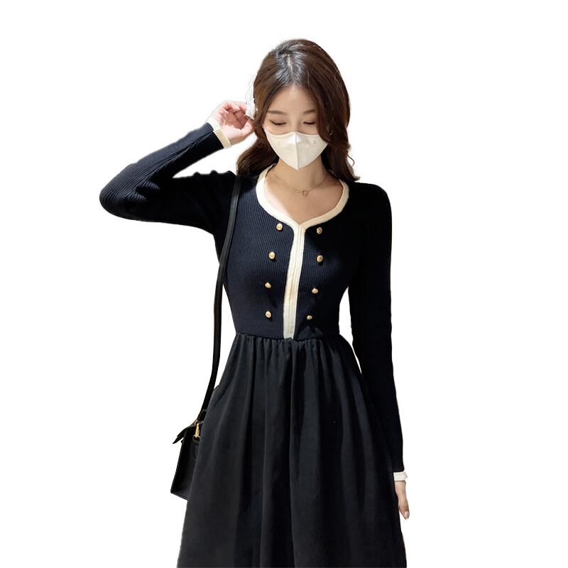 プラスサイズの婦人服2023ファットシスター春の新色コントラストスクエアカラーダブルブレストスプライシング気質ニットドレス 大きめサイズ スプリング 春物 スクウェア 8884188205062923