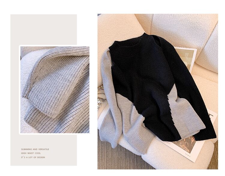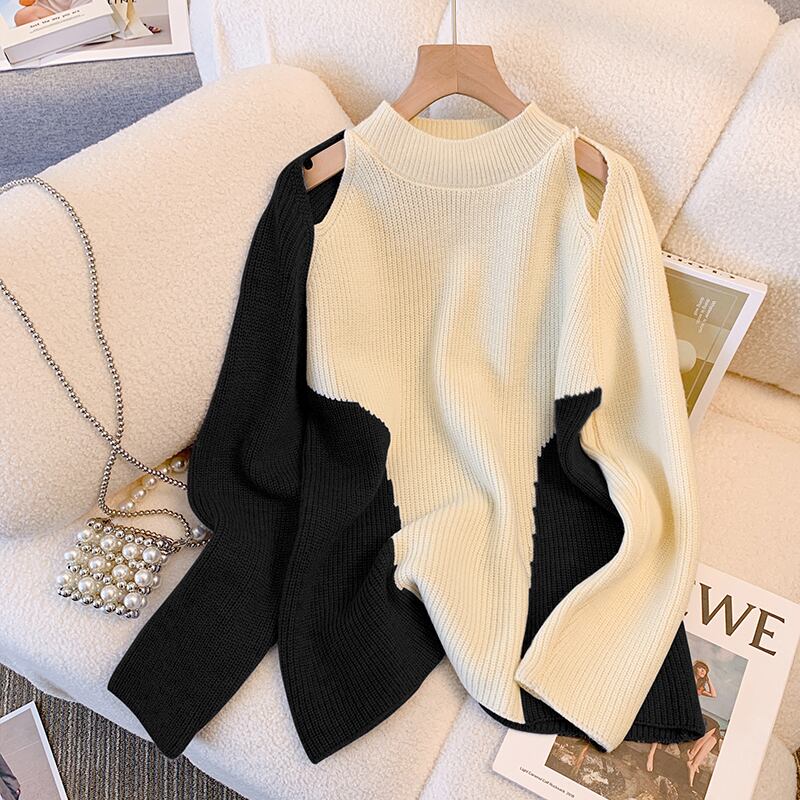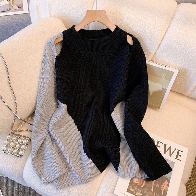 大きいサイズの婦人服 2023 春の新しいファット シスター ニッチ中空デザイン センス スプライシング コントラスト カラー オールマッチ ニット セーター 大きめサイズ スプリング 春物 8884129660598199