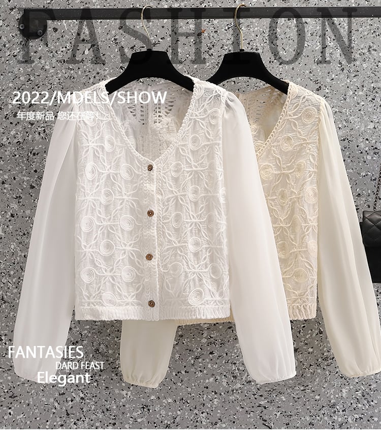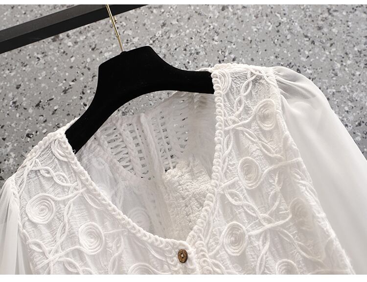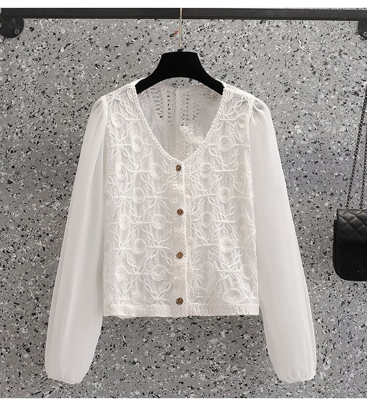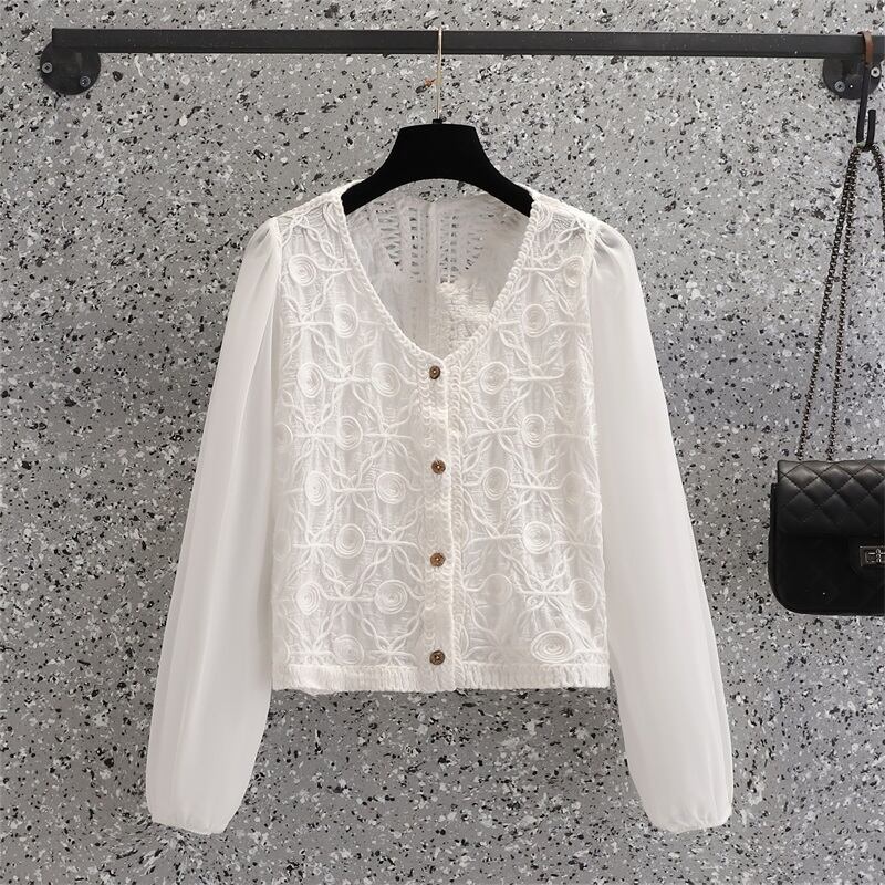 大きいサイズの婦人服2023春服ファットシスターズ新作レースシフォンシャツ長袖小さめシャツオールマッチvネックトップ女性 ロング 大きめサイズ スプリング 春物 8884158964775612