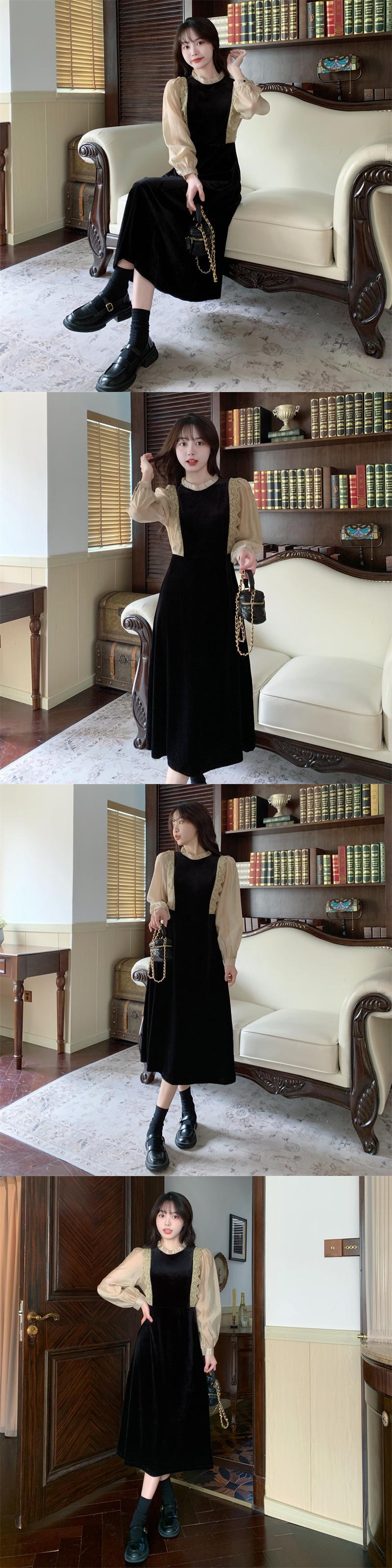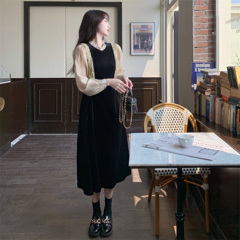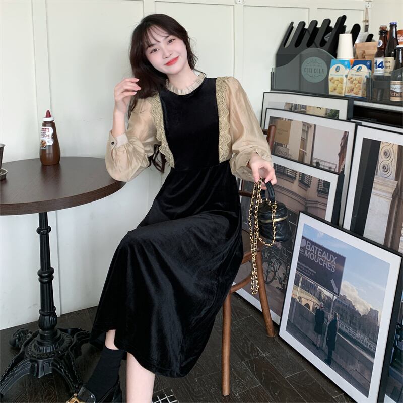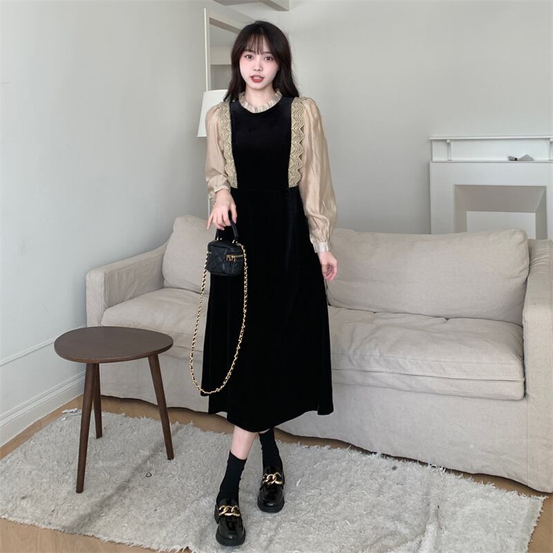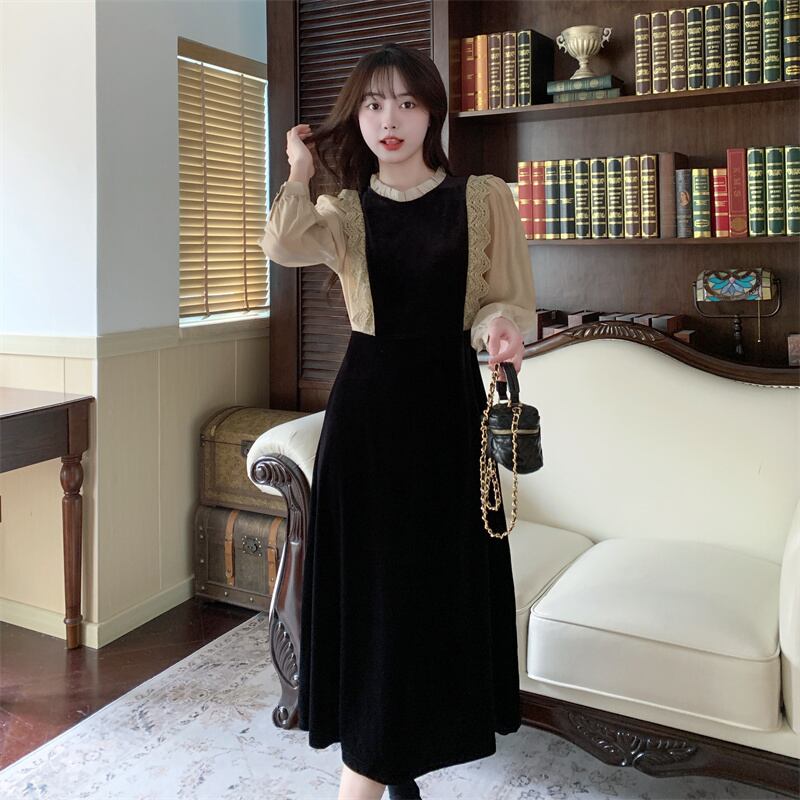 プラスサイズの婦人服 2023 トレンディな女性の春の新しい脂肪姉妹フレンチウエスト痩身レーススプライシング偽ツーピースドレス 大きめサイズ スプリング 春物 8884133786274605