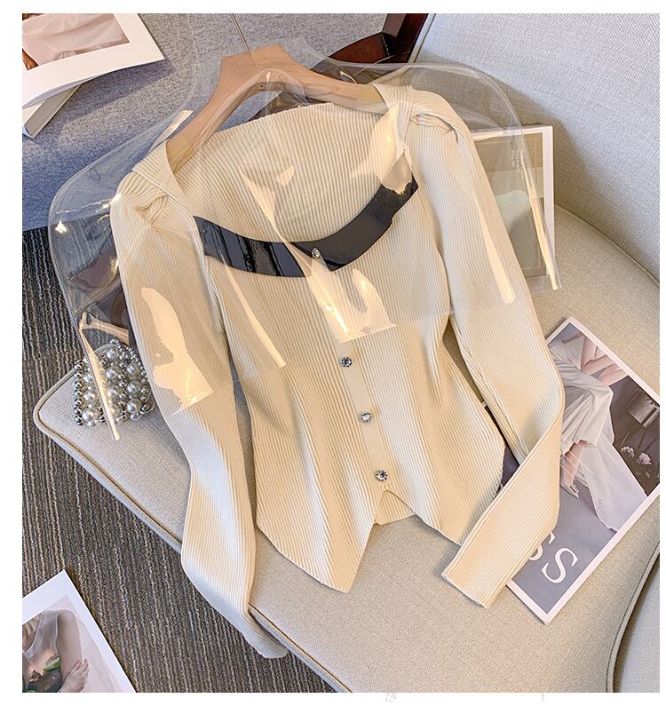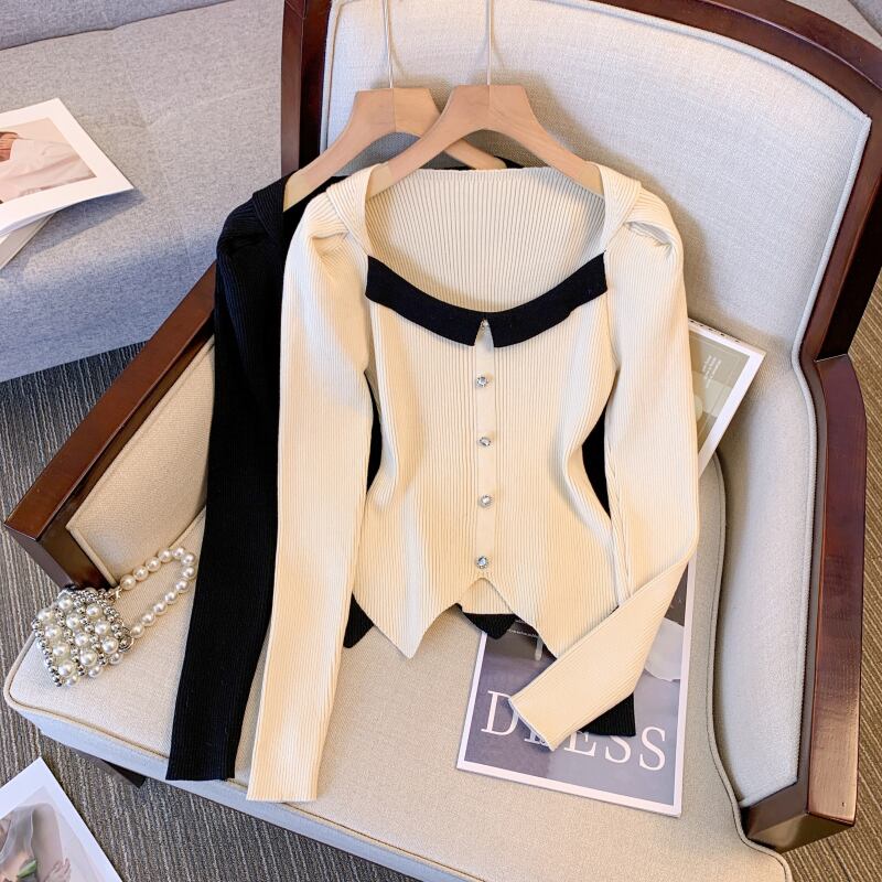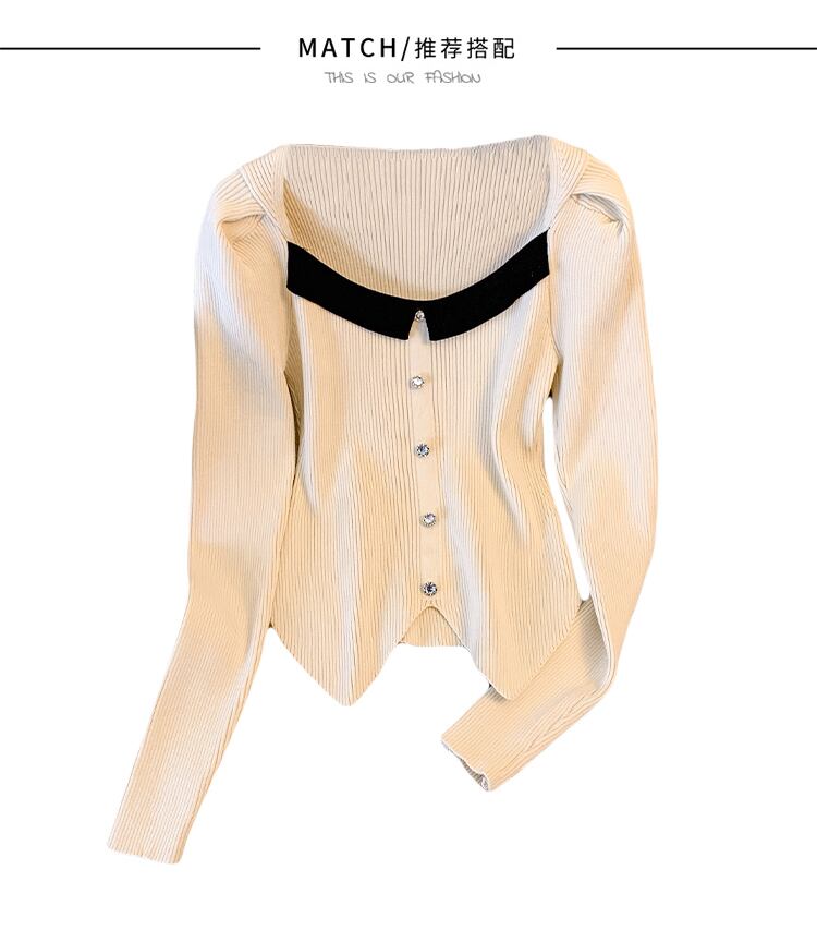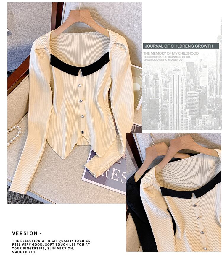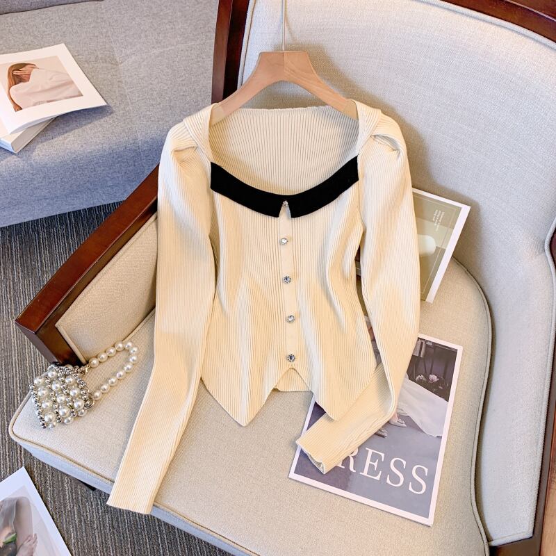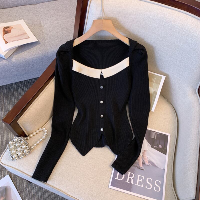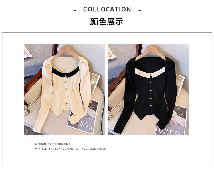 プラスサイズの婦人服 2023 脂肪姉妹春の新フレンチスプライシングスクエアカラーセータースリムショートトップ女性 大きめサイズ スプリング 春物 スクウェア 8884122852748263