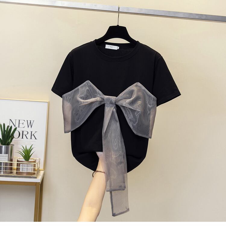 大きいサイズの婦人服 2023 夏の新しいファット シスター ルーズで薄いデザインの弓の半袖カジュアル T シャツ リボン 大きめサイズ サマー 夏物 Tシャツ 8884126576470575