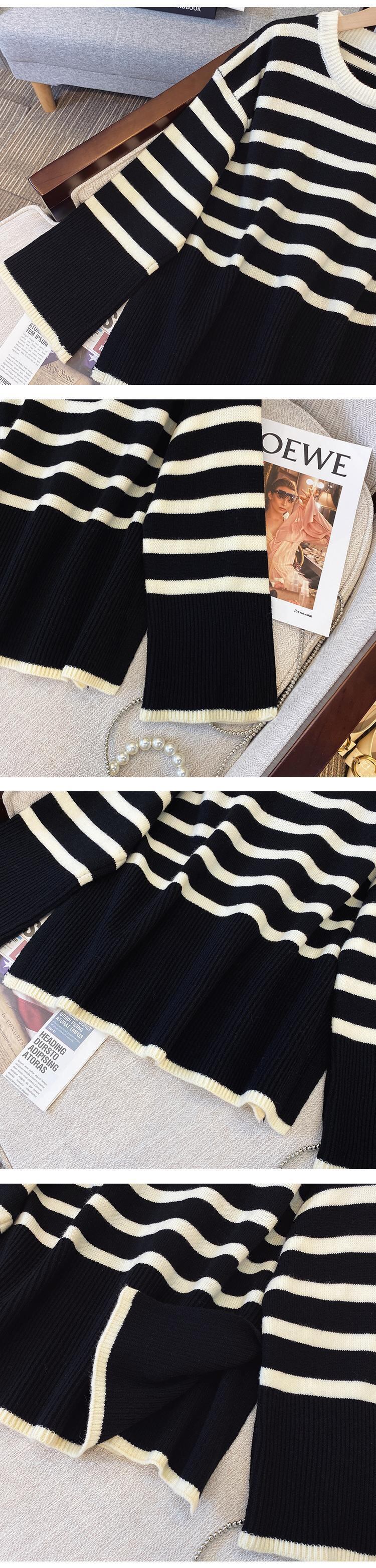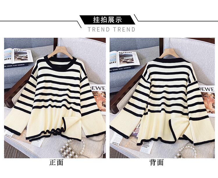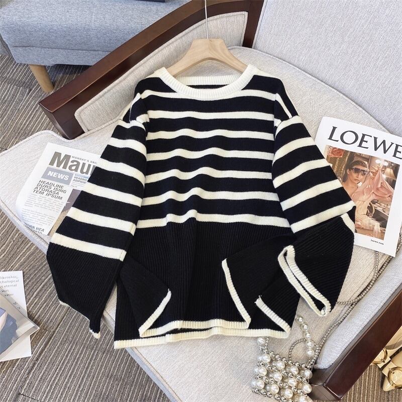 大きいサイズの婦人服 2023 トレンディな女性の春の新しいスタイルの太った姉妹の eign スタイルのゆったりとしたカバーリング肉を示す薄い縞模様の年齢を減らすすべての試合のセーター 大きめサイズ スプリング 春物 ストライプ 8884186768344987