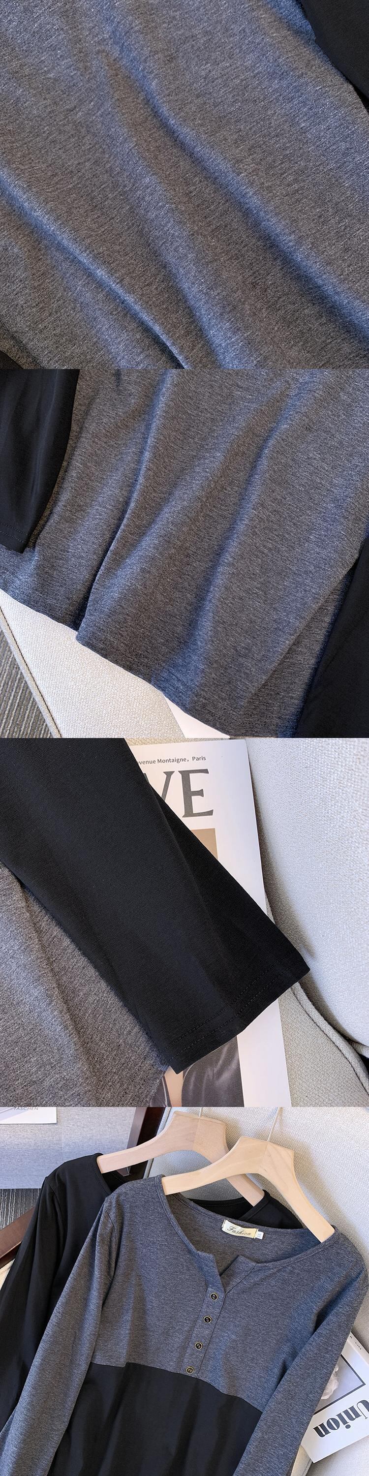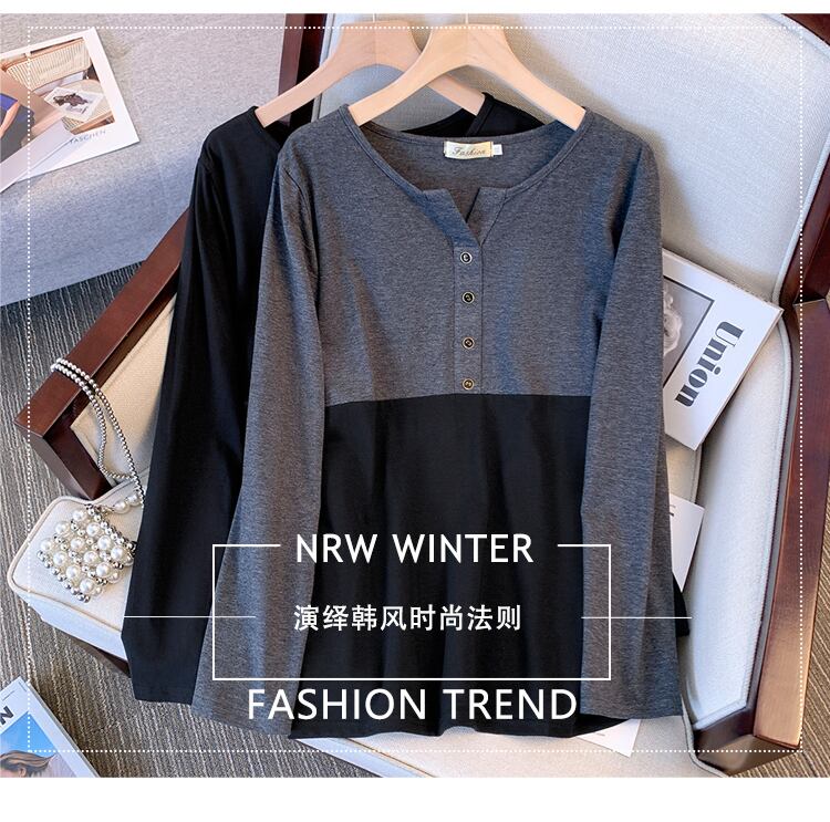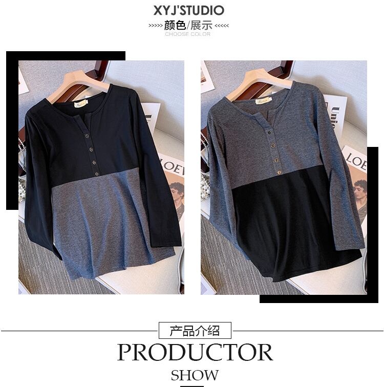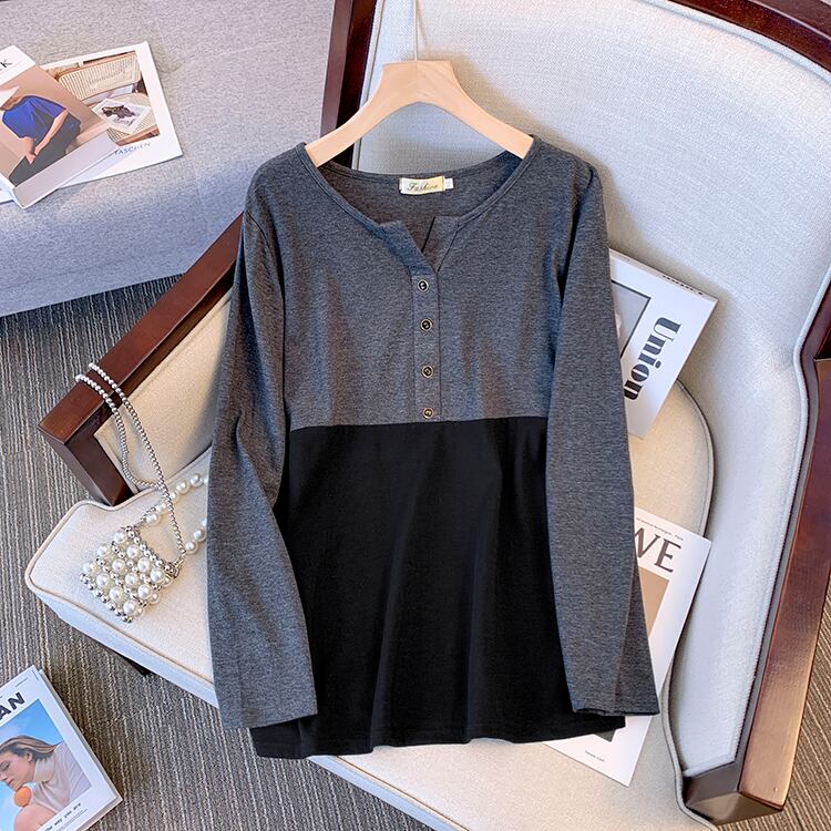 プラスサイズの婦人服 2023 春の新しいファットシスター長袖ファッションルーズカラーマッチングカラーブロッキング腹気質底入れ Tシャツ ロング 大きめサイズ スプリング 春物 8884167680591289