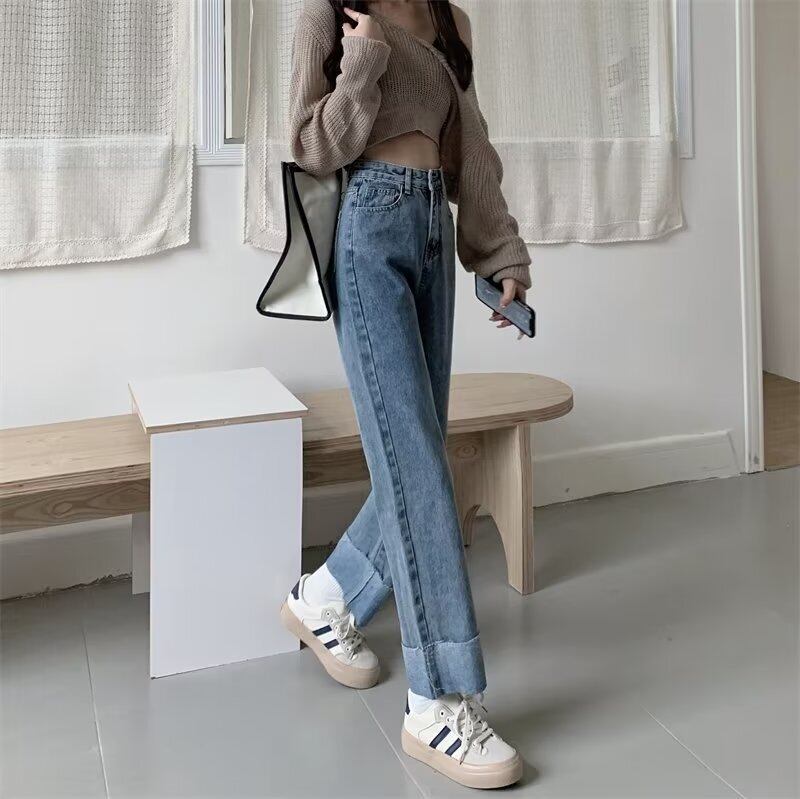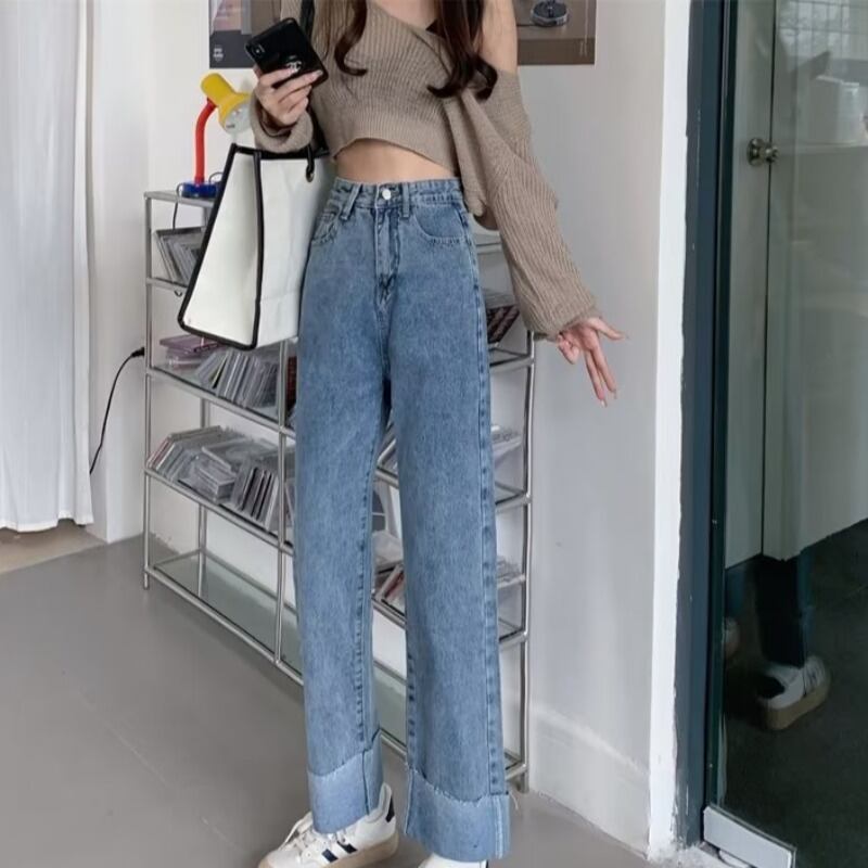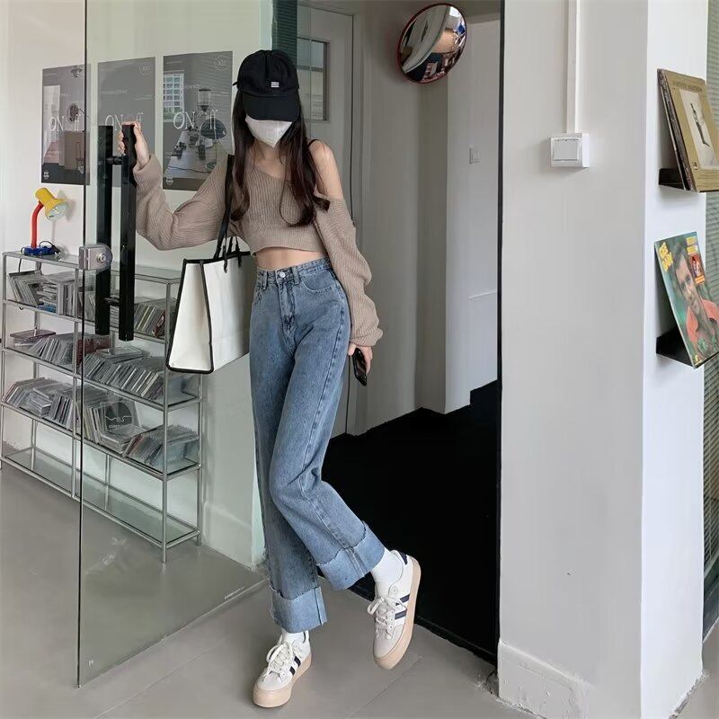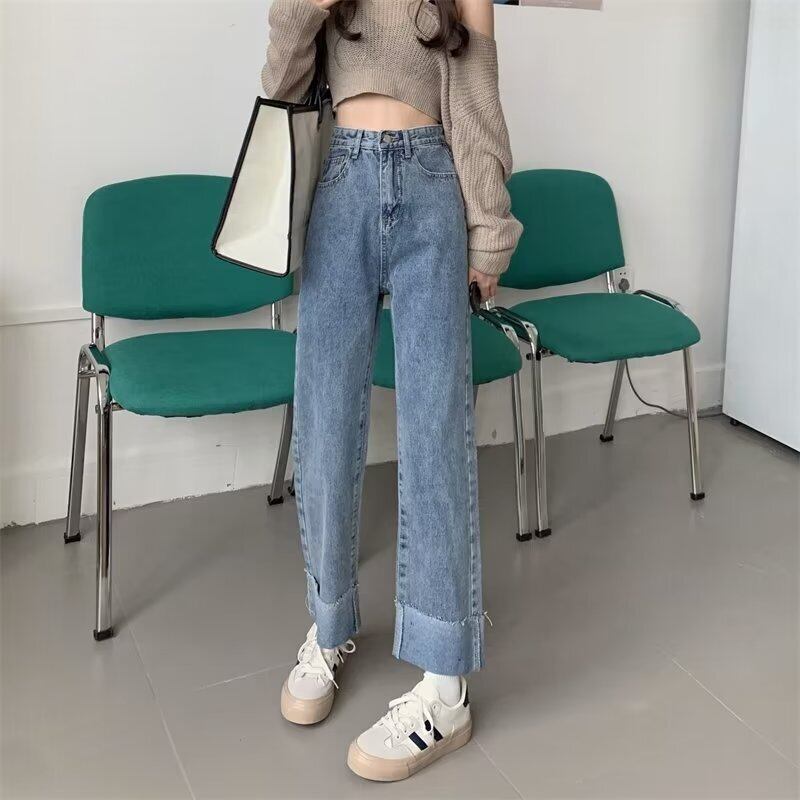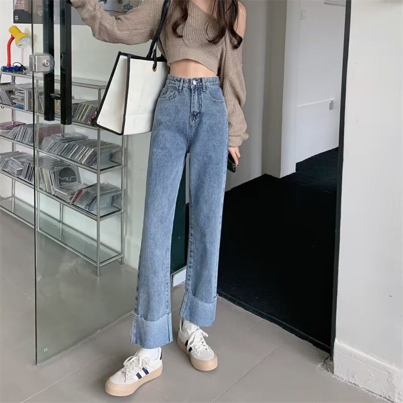 大きいサイズの婦人服 2023 トレンディな女性の春の新しいファット シスター ハイウエスト ストレート ルーズ スリム ワイドレッグ ロール デニム パンツ 大きめサイズ スプリング 春物 8884161111622574
