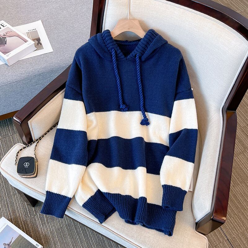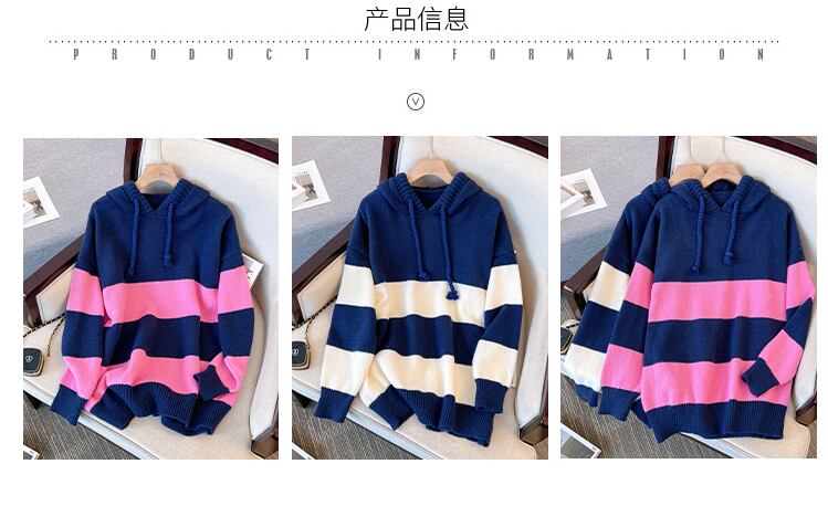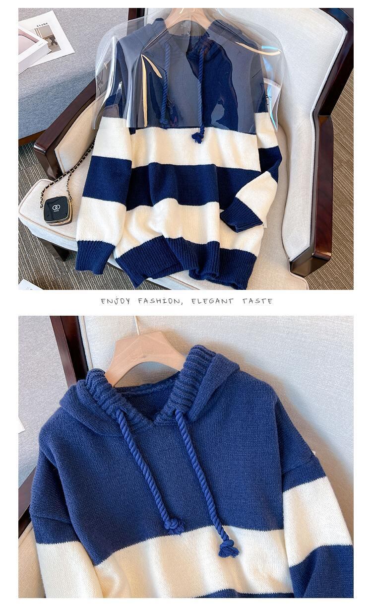 大きいサイズの婦人服 2023 春の新しい太った姉妹 eign スタイルの年齢を減らすカジュアル ストライプ フード付きルーズ カラーブロッキング ニット セーター 大きめサイズ スプリング 春物 8884112578480929