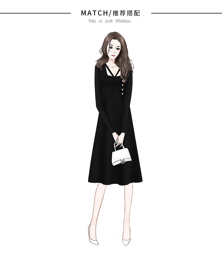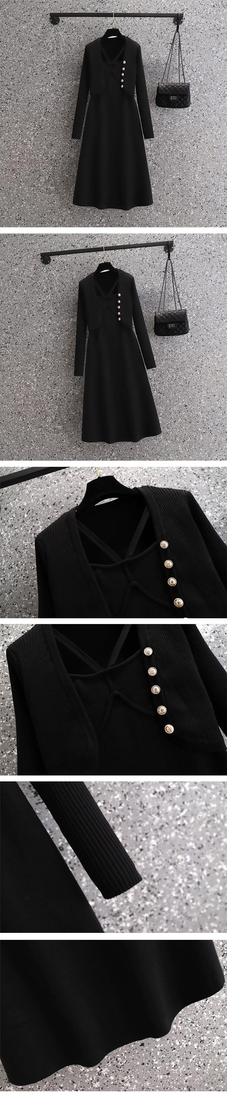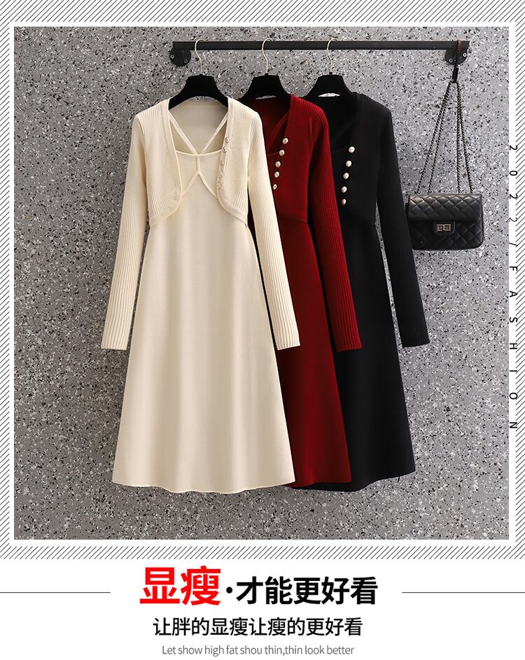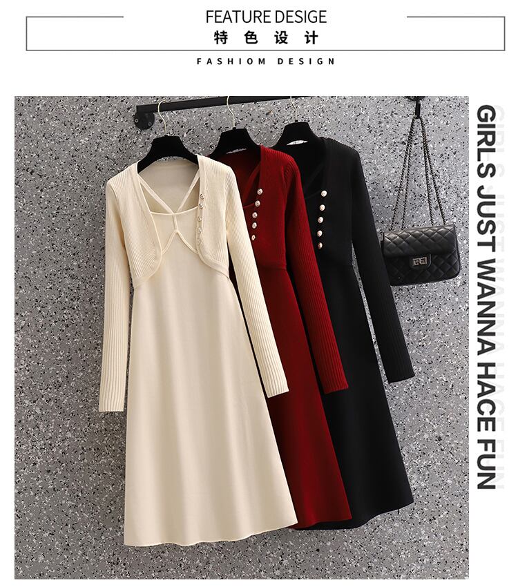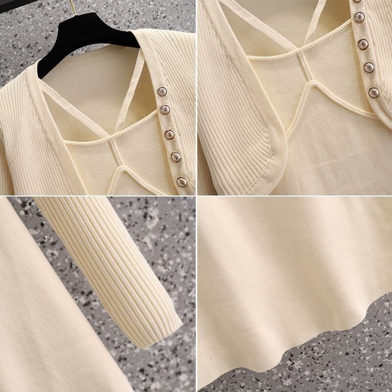 大きいサイズの婦人服 2023 春の新しいデザイン感覚ウエスト ニット フェイク 2 ピース オールマッチ無地長袖ドレス ロング 大きめサイズ スプリング 春物 ソリッドカラー 8884116440788726