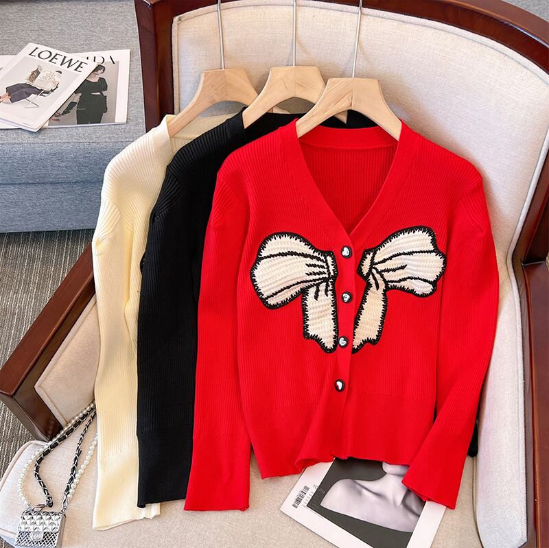 大きいサイズの婦人服 2023 春の新しいスタイルの太った姉妹のデザインの不規則な配色のちょう結びの年齢を減らすニットのセーター リボン 大きめサイズ スプリング 春物 8884139812675947
