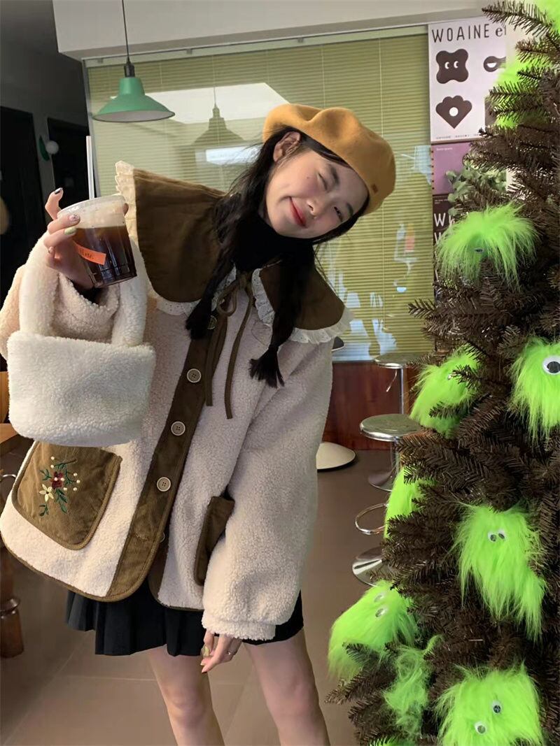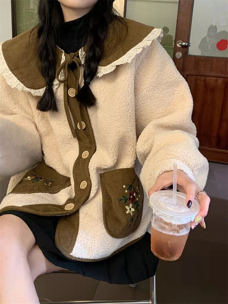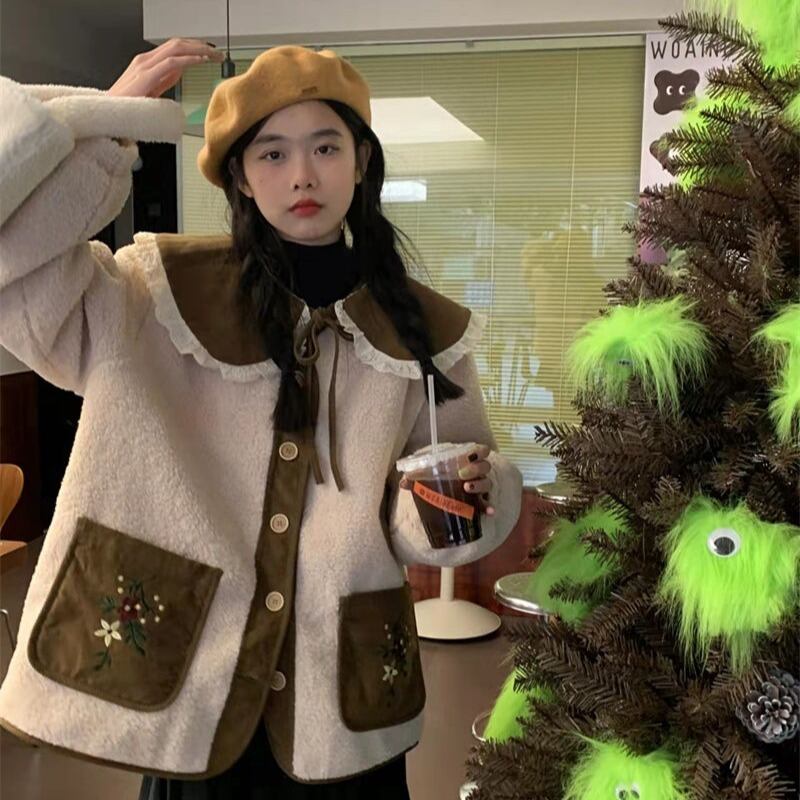 プラスサイズの婦人服 2023 ファットシスター春の新しいレトロな人形の襟刺繍ラムウールスリムキルティングジャケット レッド 大きめサイズ スプリング 春物 8884159675168837