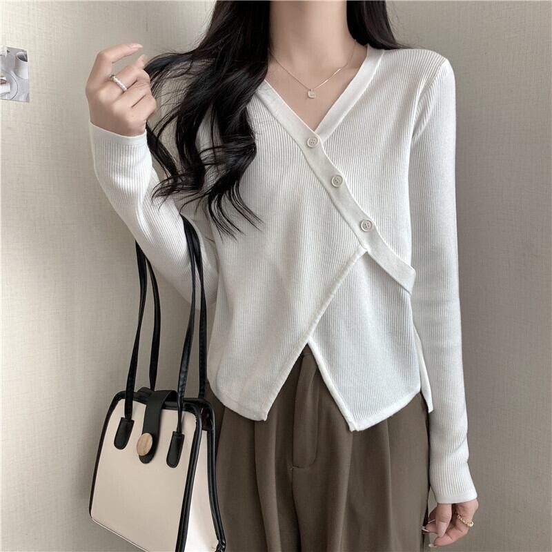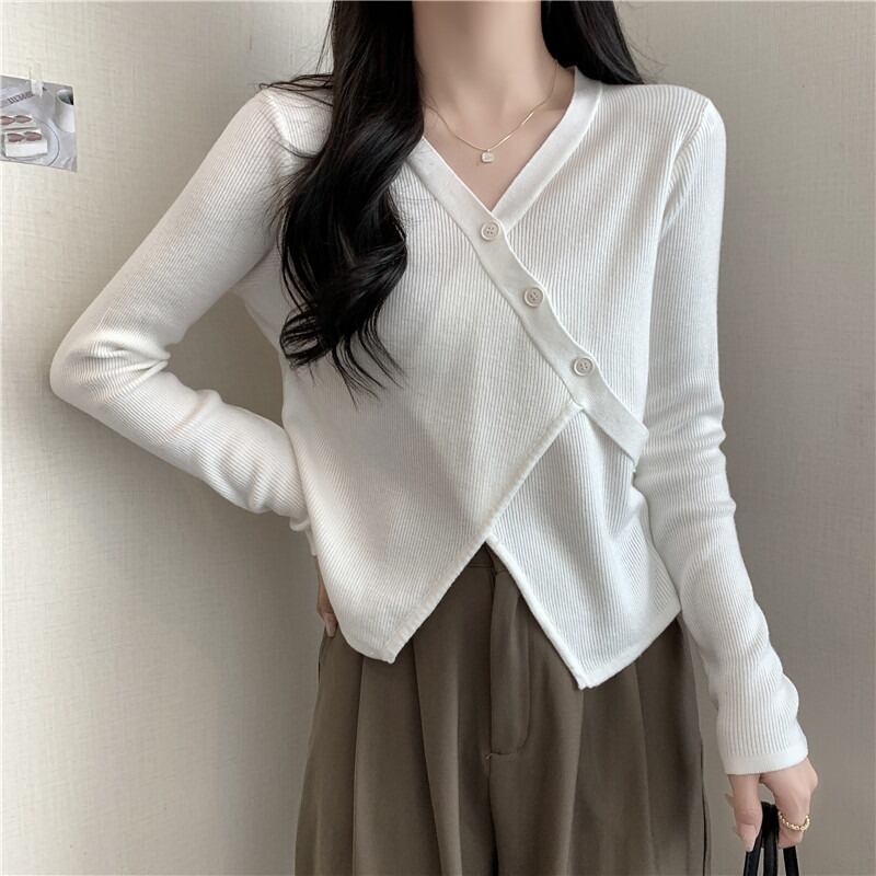 大きいサイズの婦人服 2023 トレンディな女性の春の新しいスタイルのファットシスター不規則な斜めのバックル V ネックサイドシングルブレストニットセーターの女性 大きめサイズ スプリング 春物 Vネック 8884118075014499