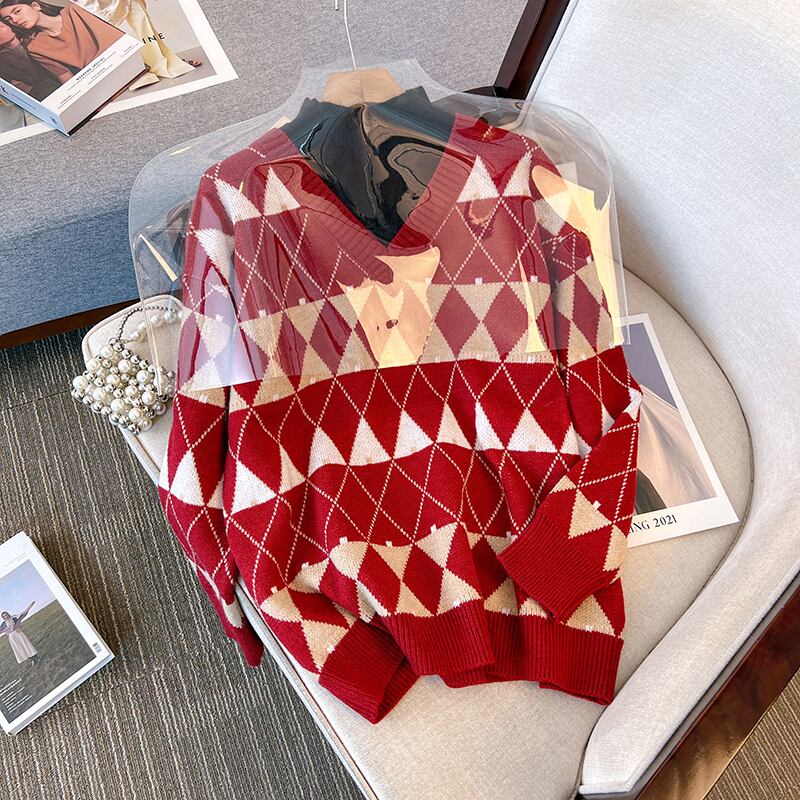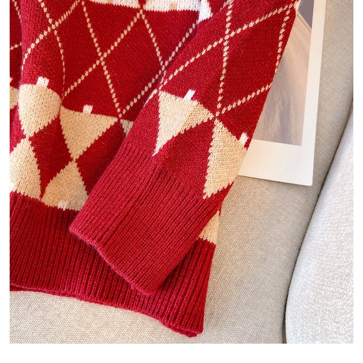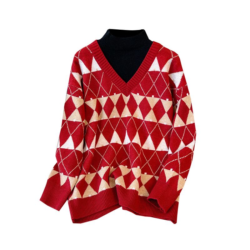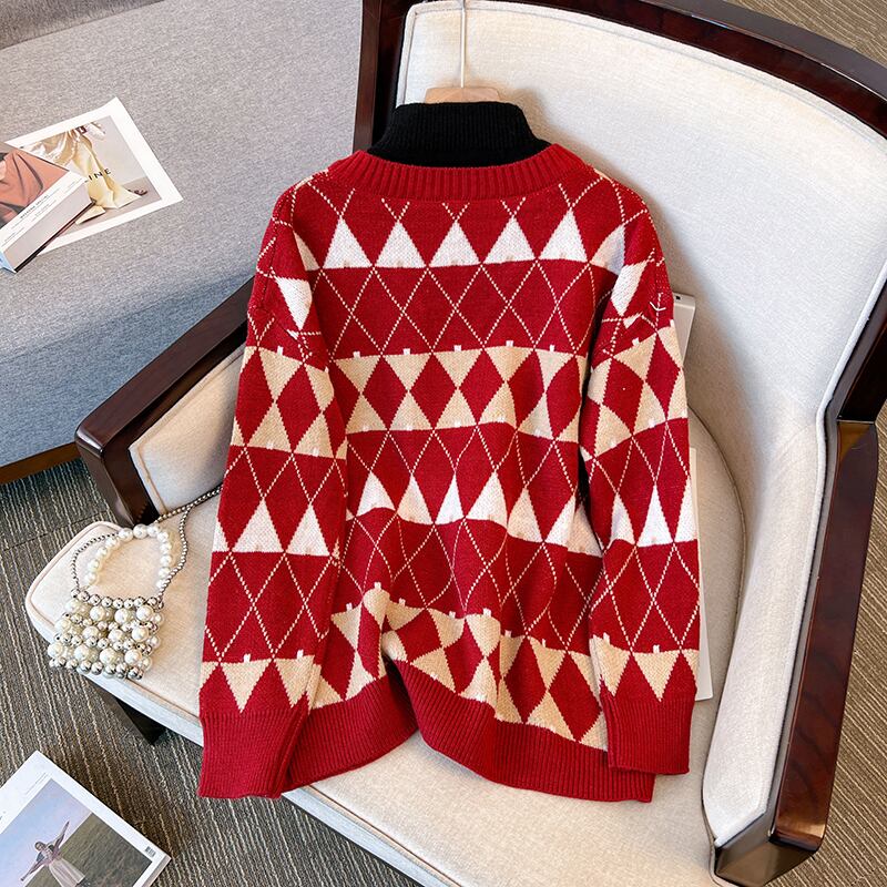 プラスサイズの婦人服2023ファットシスター春の新作フェイクツーピースハーフハイカラーニットトップ気質チェック柄セーター 大きめサイズ スプリング 春物 888411757058152