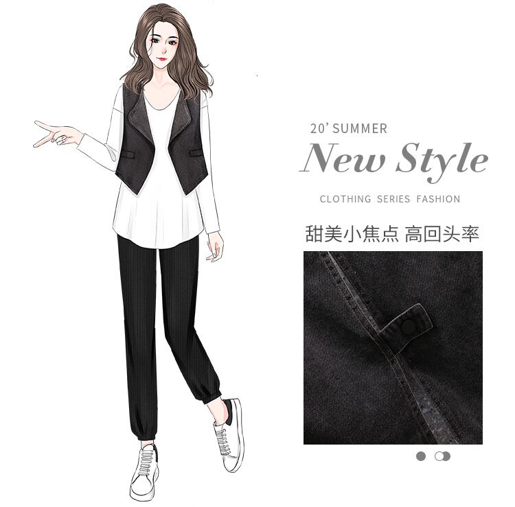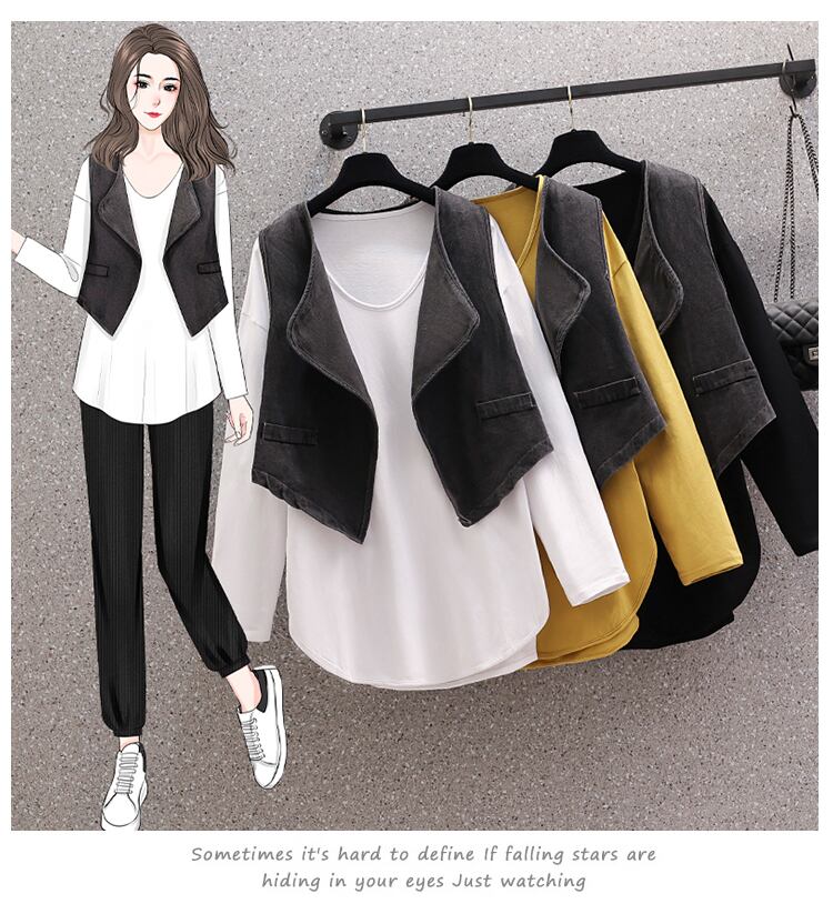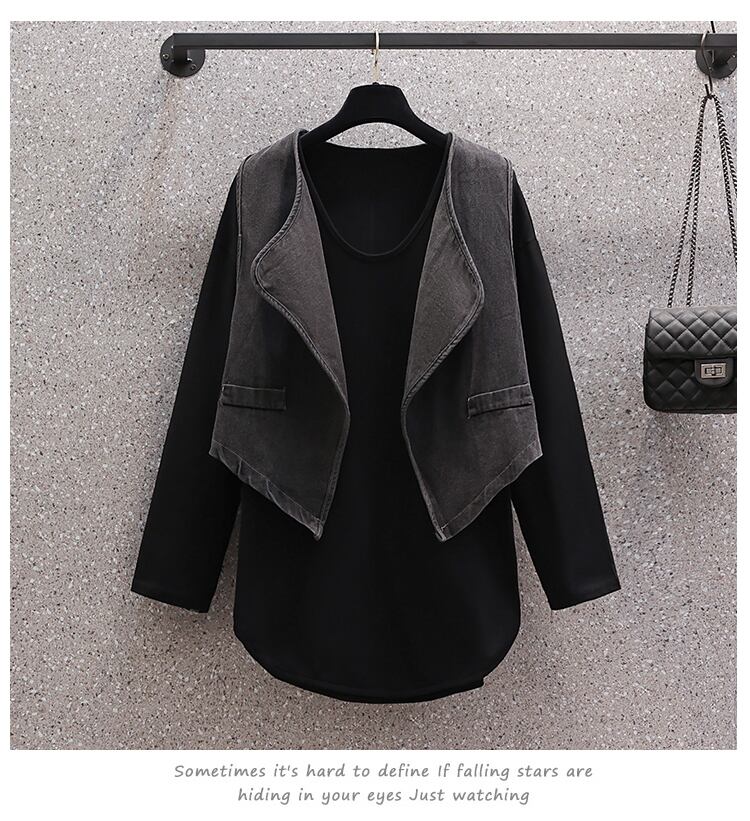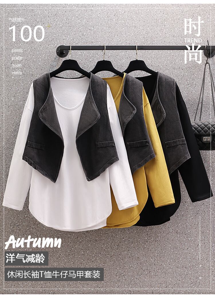 大きいサイズの婦人服 2023 春服ファット シスターズ新しい長袖 T シャツ デニム ベスト痩身洋風ツーピース スーツ ロング 大きめサイズ スプリング 春物 Tシャツ 8884187772416004