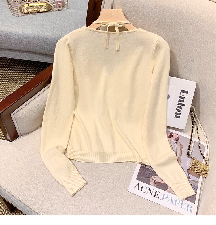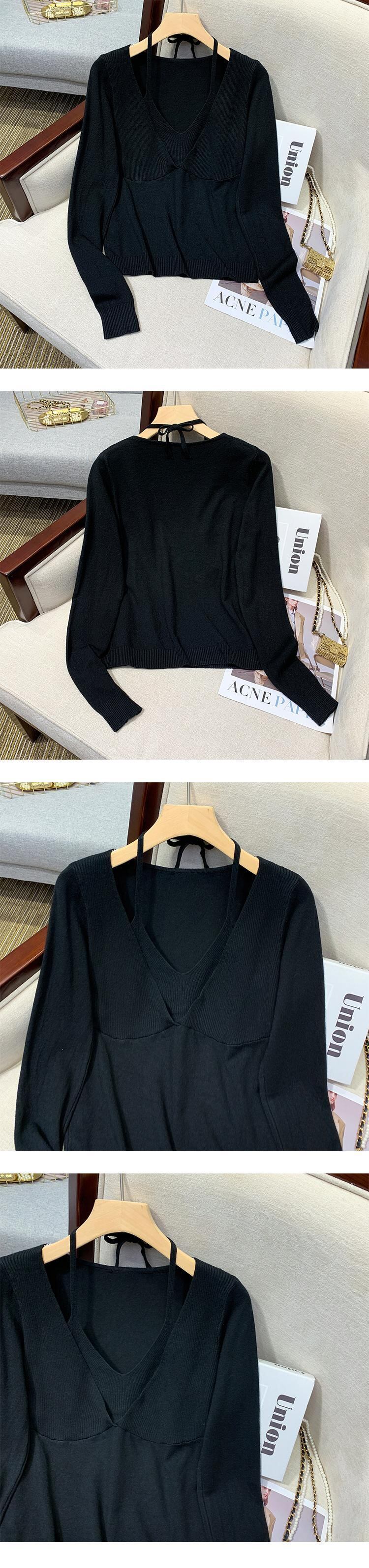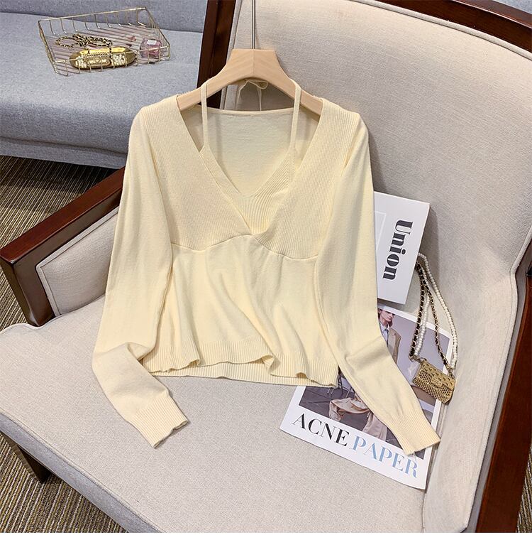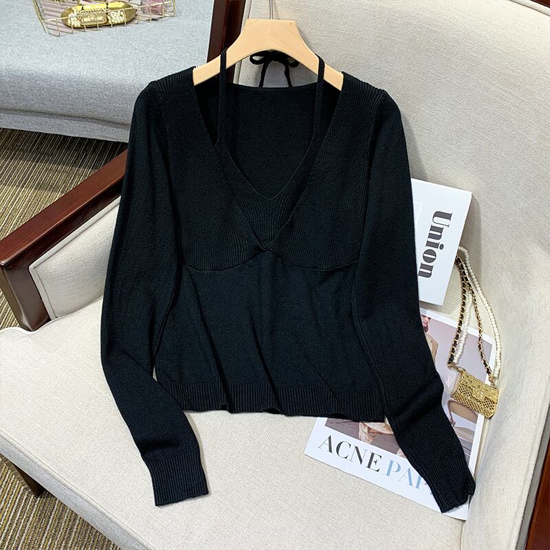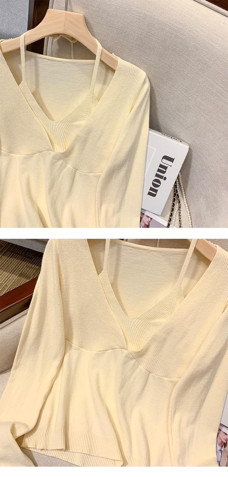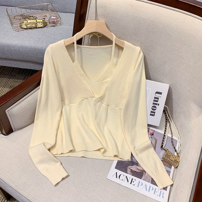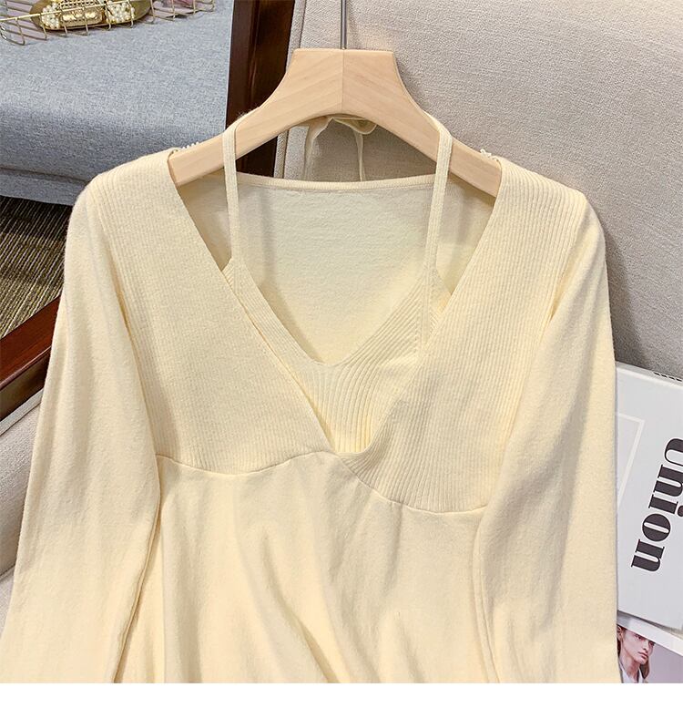 プラスサイズの婦人服 2023 ファットシスター春の新しいぶら下げネック V ネックフェイクツーピーススリムフィット底入れシャツニットセータートップ 大きめサイズ スプリング 春物 Vネック 8884151701508302