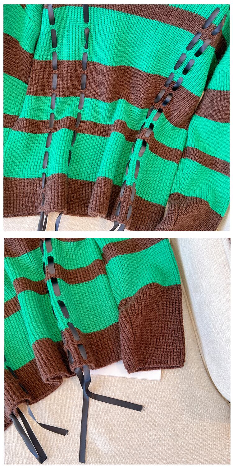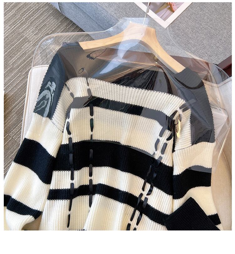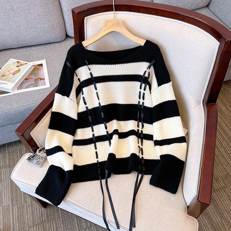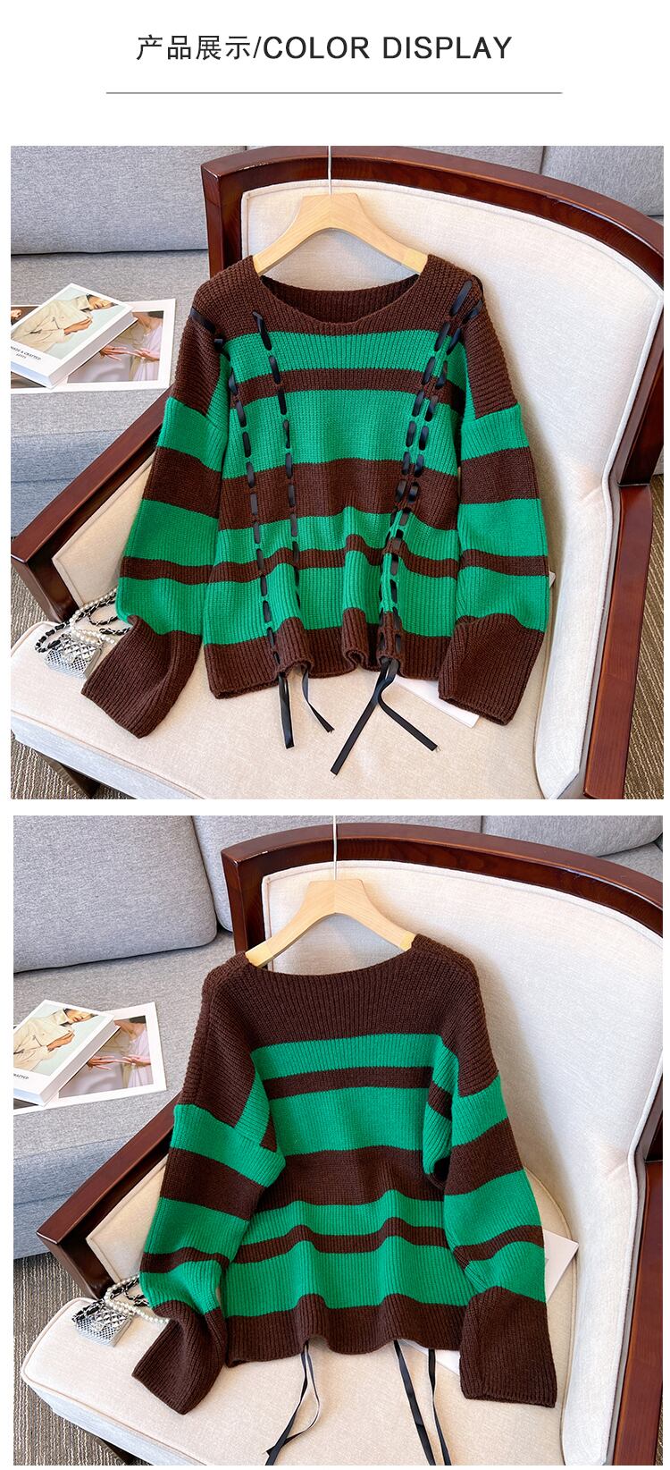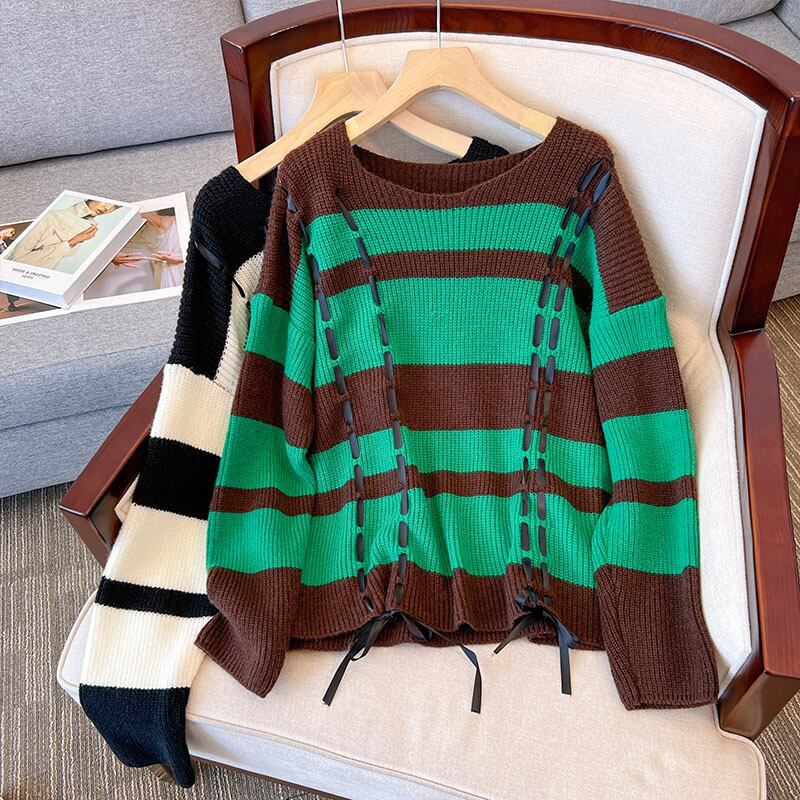 プラスサイズの婦人服2023春の新しいスタイルのファットシスタールーズなデザインセンスニッチカラーコントラストストライプシックなニットセーター 大きめサイズ スプリング 春物 888415569991169