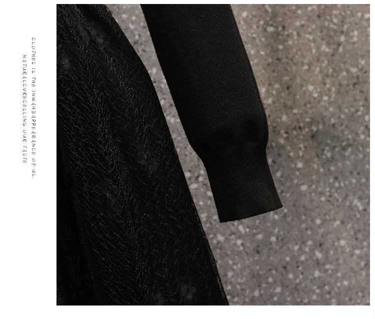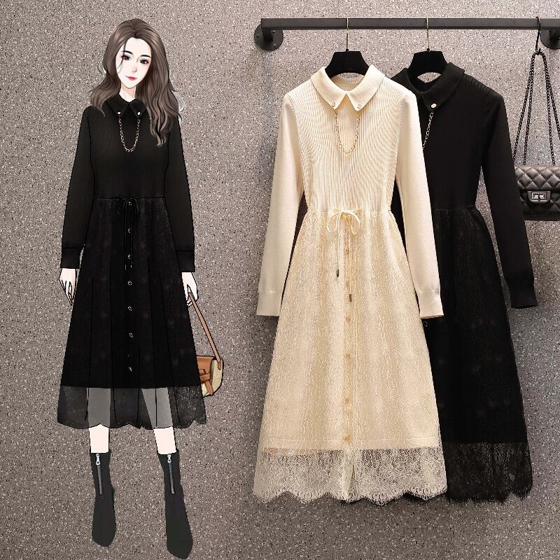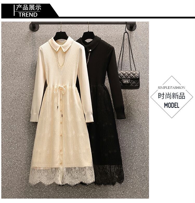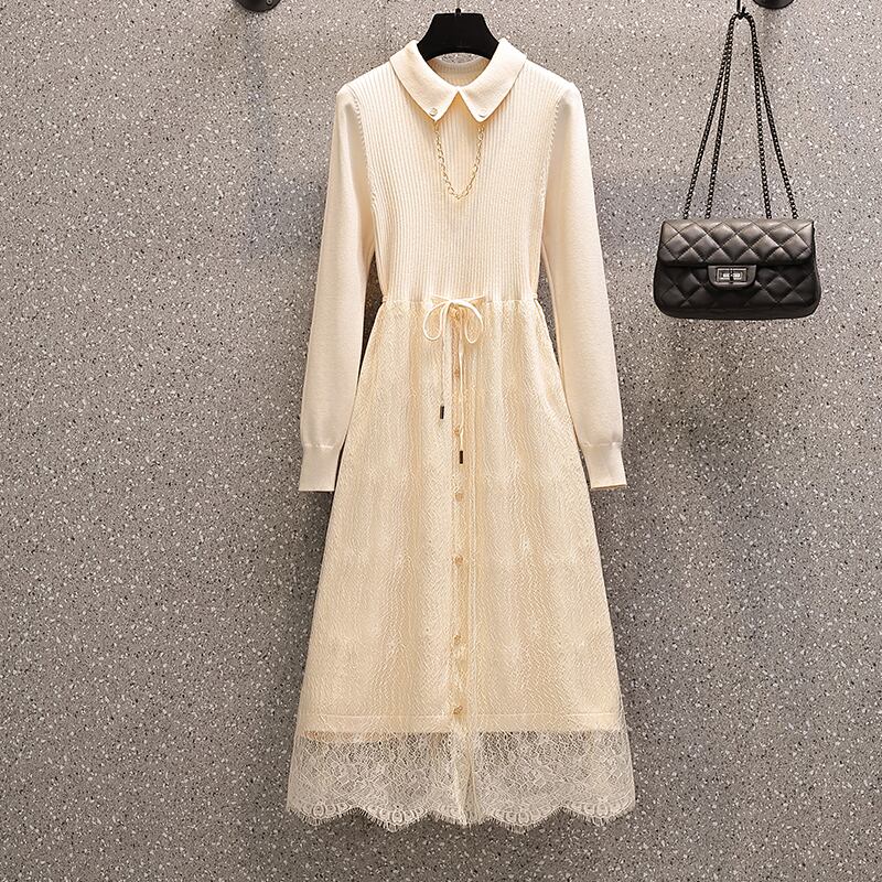 プラスサイズの婦人服 2023 ファットシスター春の新巾着ウエスト痩身セーターレーススプライシングドレス女性 大きめサイズ スプリング 春物 8884170531738405