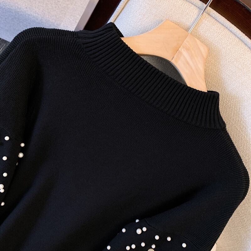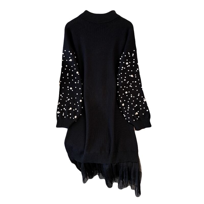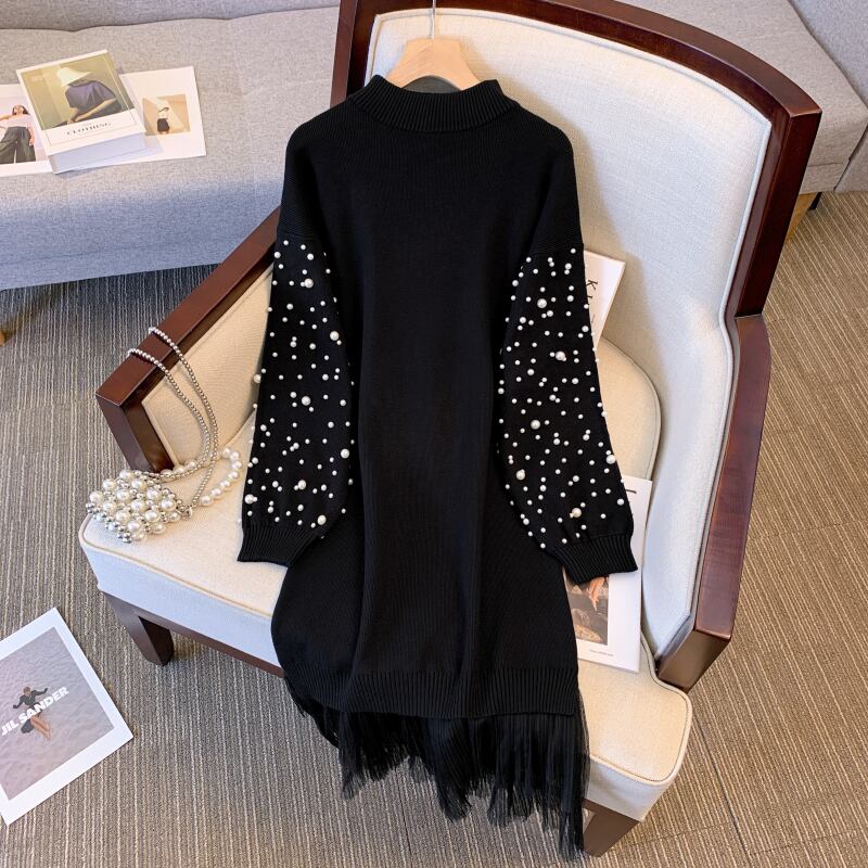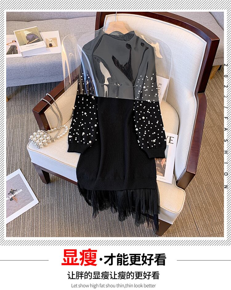 大サイズの婦人服 2023 脂肪姉妹春の新重工業ビーズメッシュスプライシング厚いセータードレス女性 大きめサイズ スプリング 春物 8884124072521305