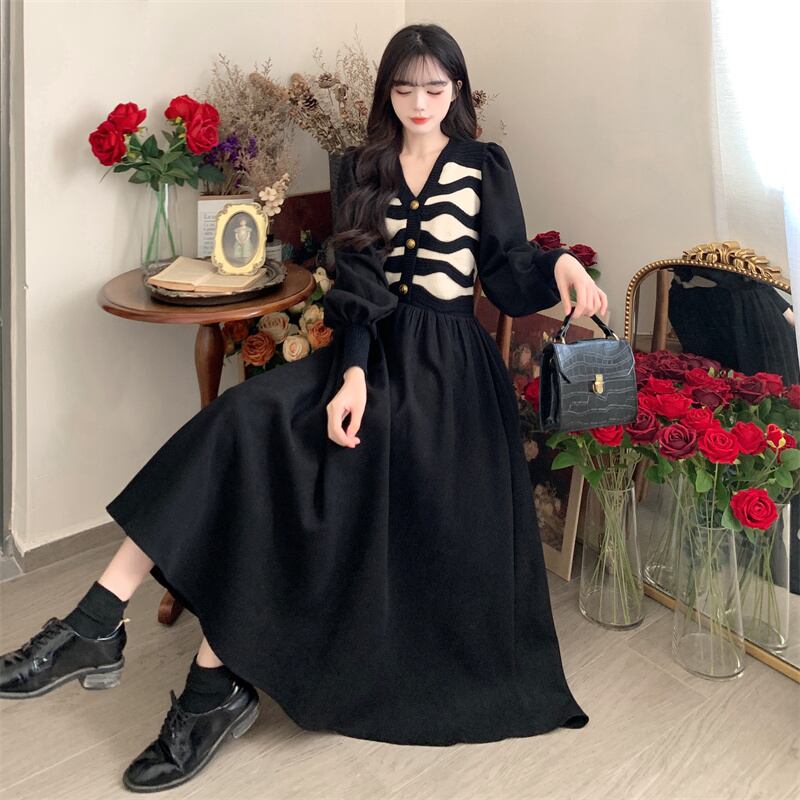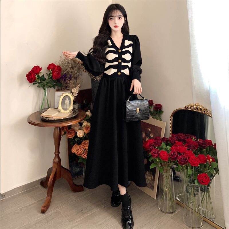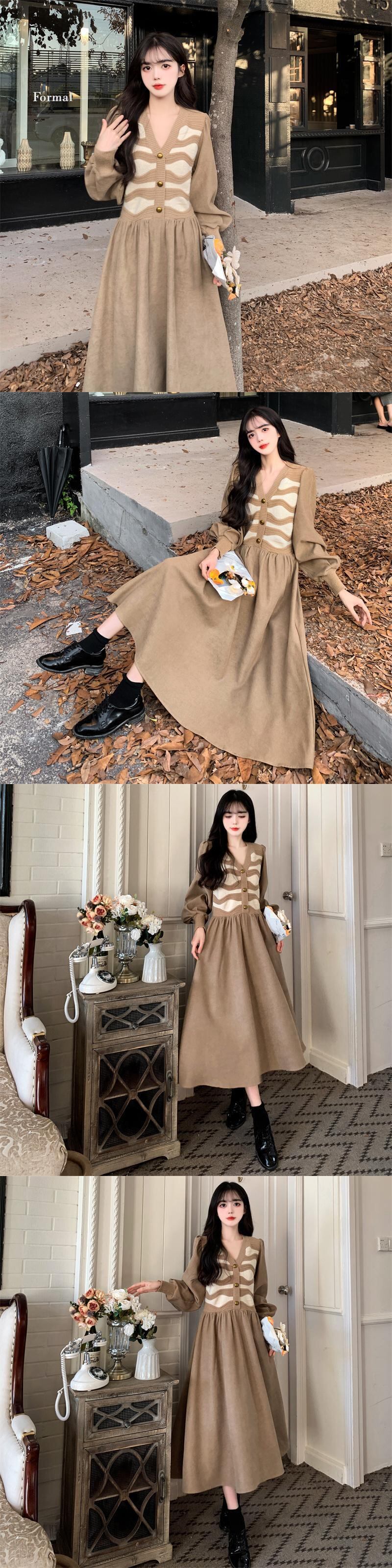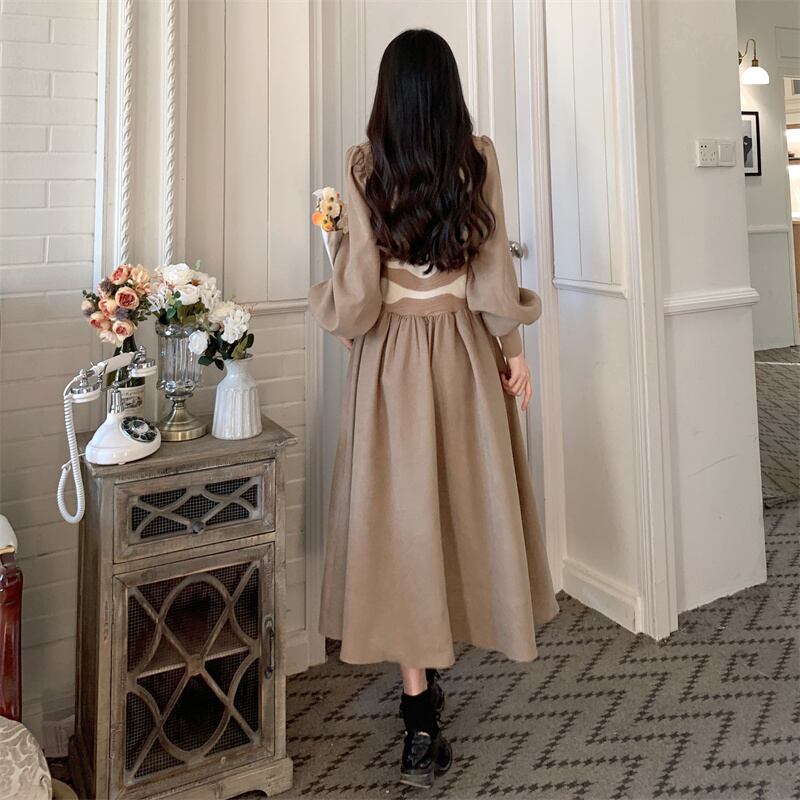 プラスサイズの婦人服 2023 ファットシスター春の新カラーマッチングニットスプライシング偽二枚コーデュロイドレス女性 大きめサイズ スプリング 春物 8884153789756075