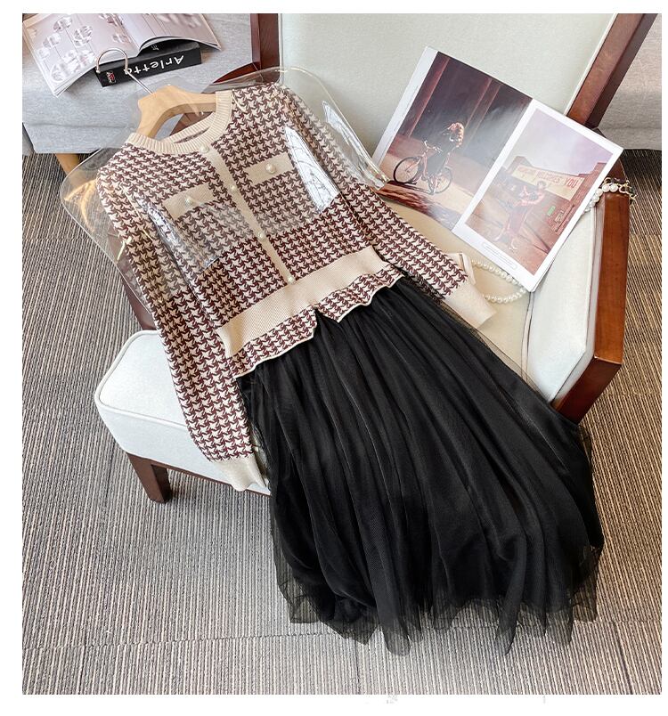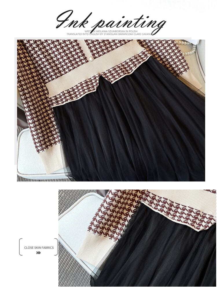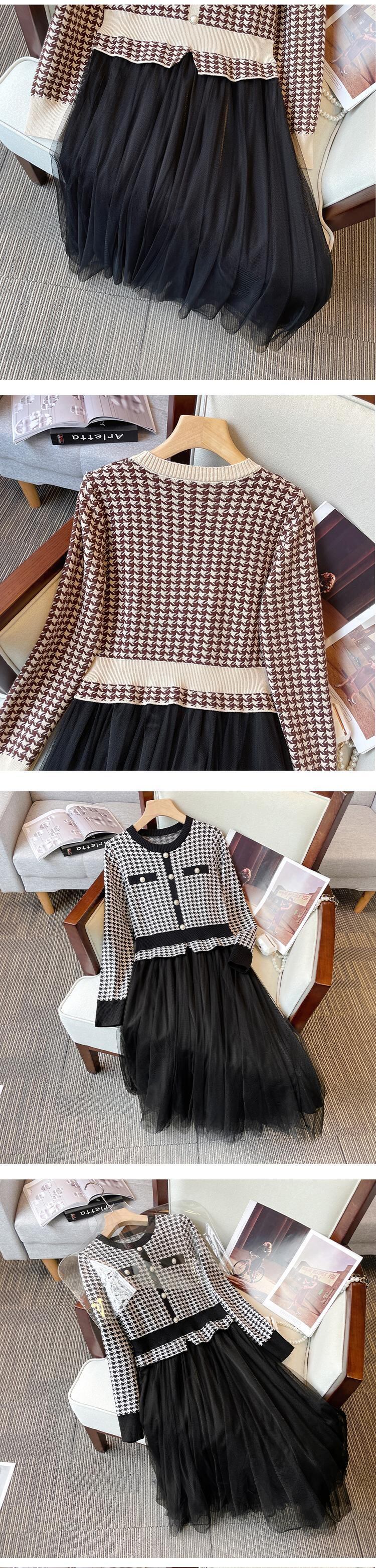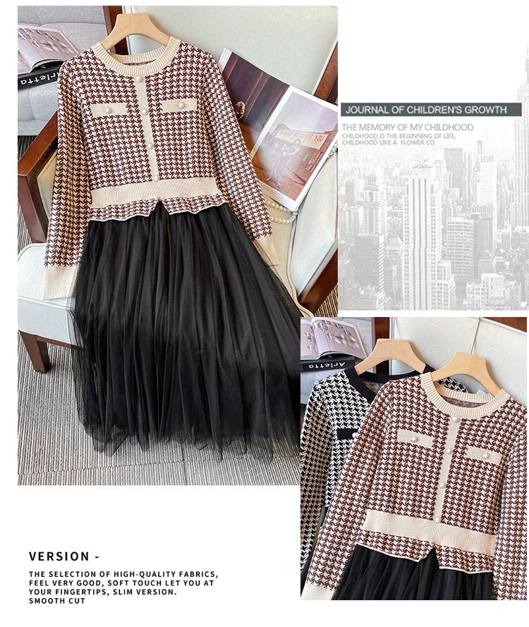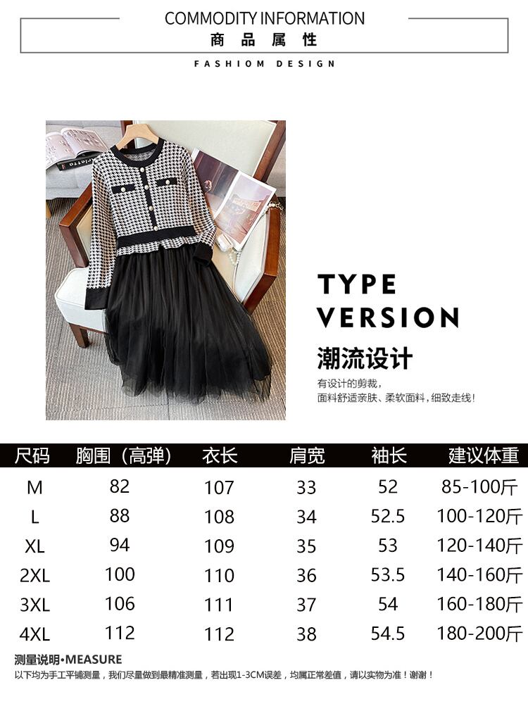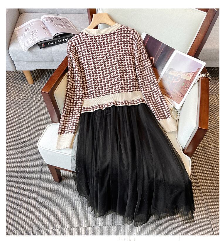 プラスサイズの婦人服 2023 ファットシスター春の新千鳥格子ウエスト痩身メッシュステッチニットドレス 大きめサイズ スプリング 春物 8884183519308836