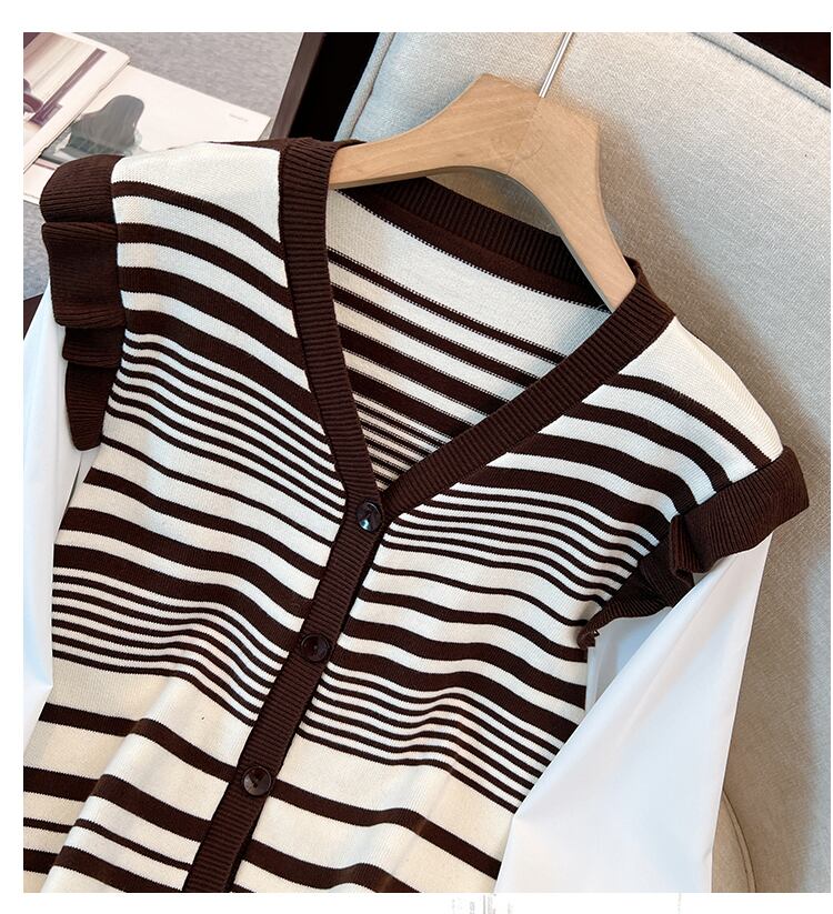 プラスサイズの婦人服 2023 ファットシスター春の新フェイクツーピースフレンチウッド耳ストライプ V ネックセーター女性 大きめサイズ スプリング 春物 Vネック 8884150340079181