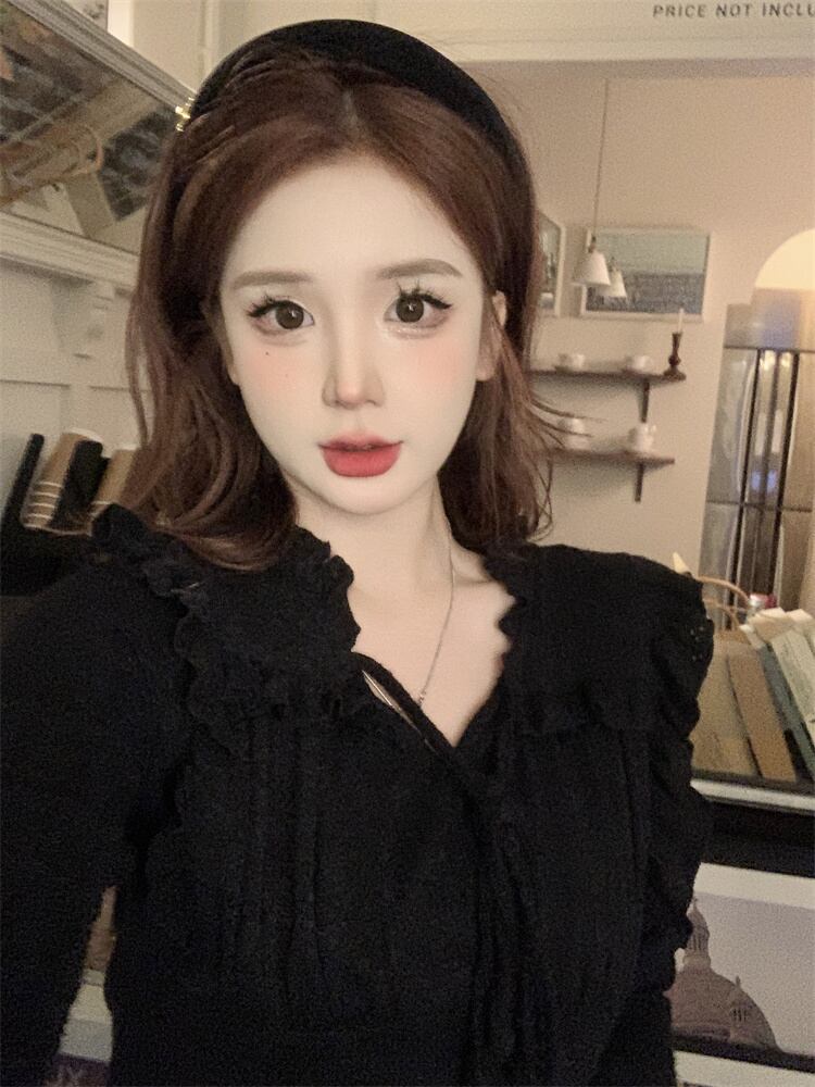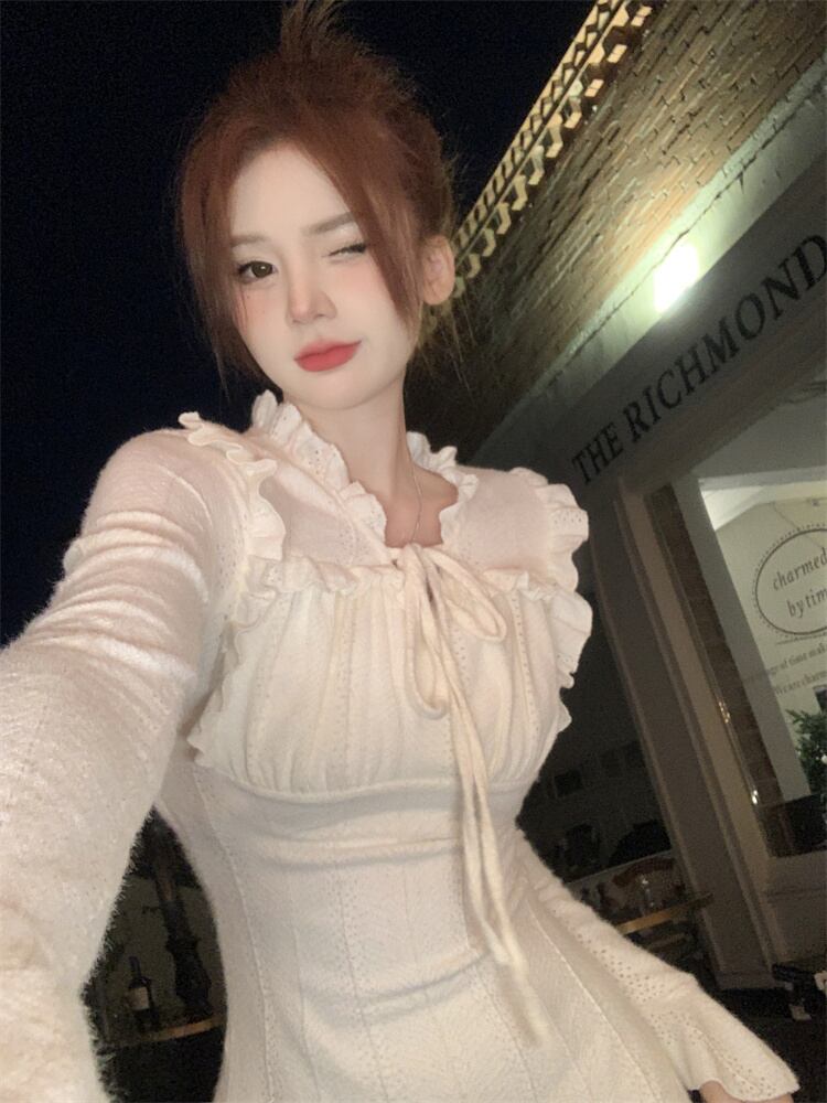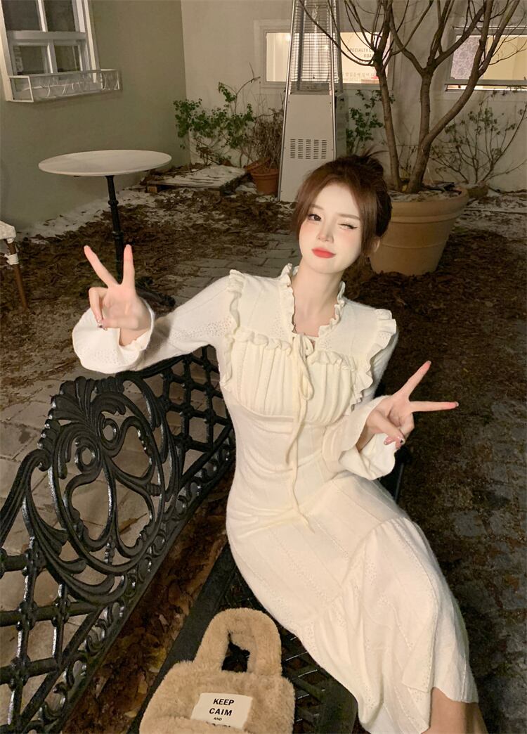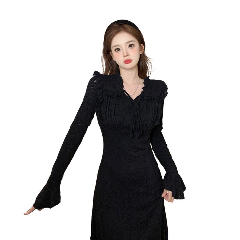 プラスサイズの婦人服 2023 脂肪姉妹春の新ストラップニット気質ロングスカートフリル長袖ドレス女性 大きめサイズ スプリング 春物 8884120060442226