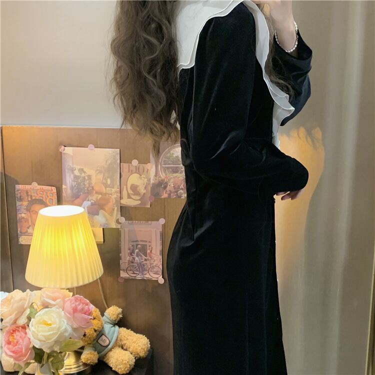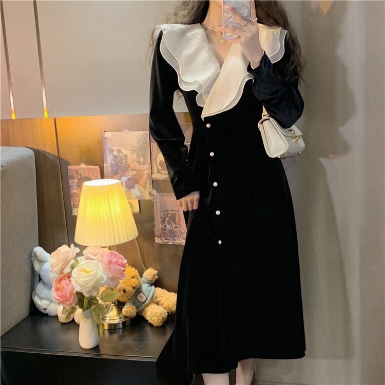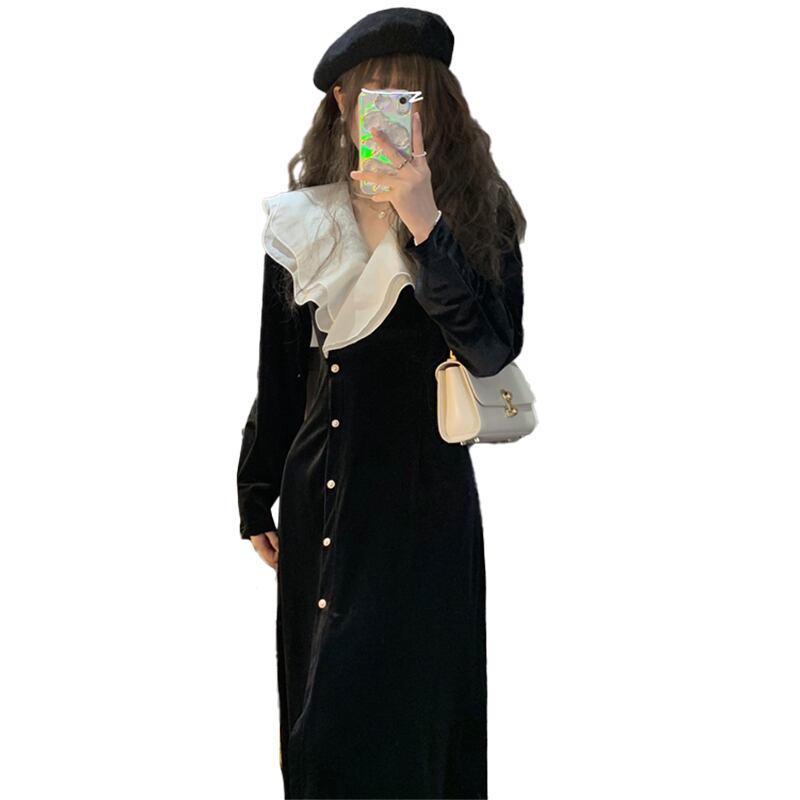 大きいサイズの婦人服 2023 脂肪姉妹春の新しい蓮の葉 V ネックの配色ブレスト ボタン ベルベット スリム ドレス女性 大きめサイズ スプリング 春物 Vネック 8884158305068275