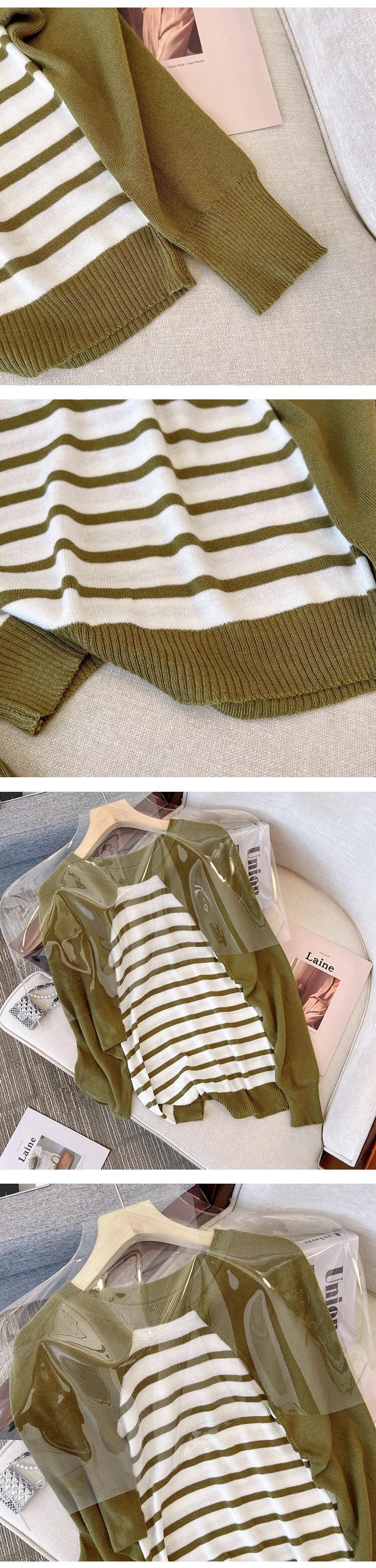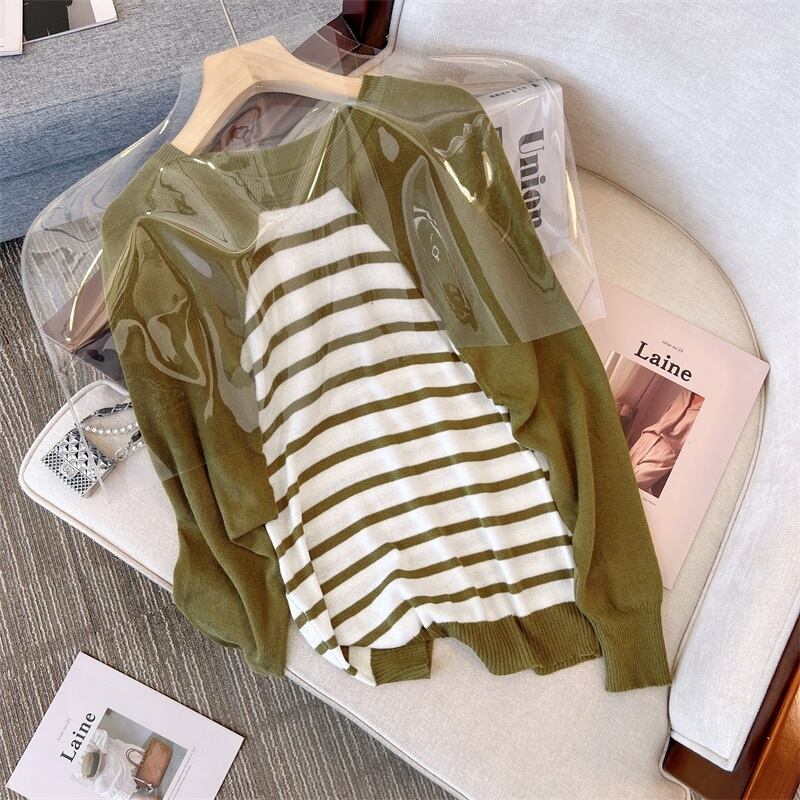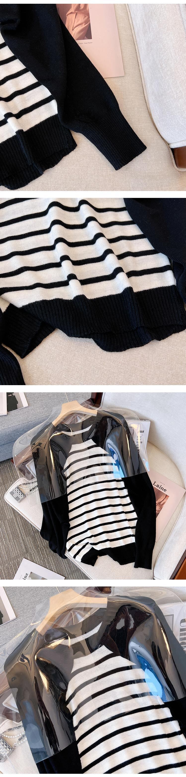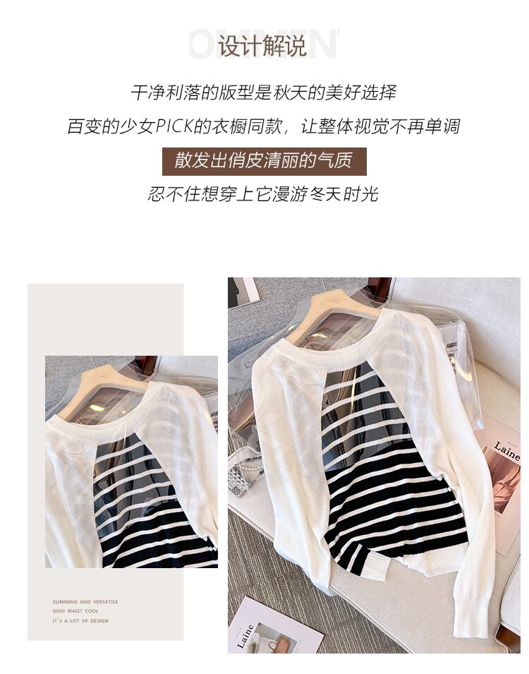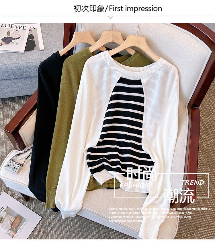 プラスサイズの婦人服 2023 ファットシスター春の新フェイクツーピースストライプセーターステッチ長袖ラウンドネックトップ女性 ロング 大きめサイズ スプリング 春物 Oネック 8884153632706586