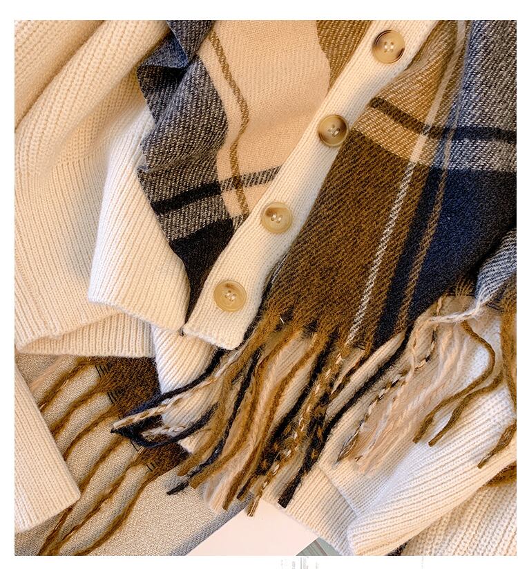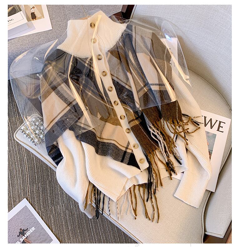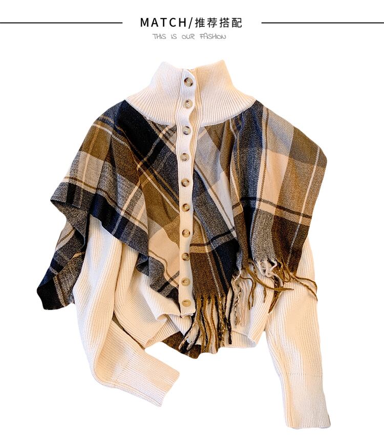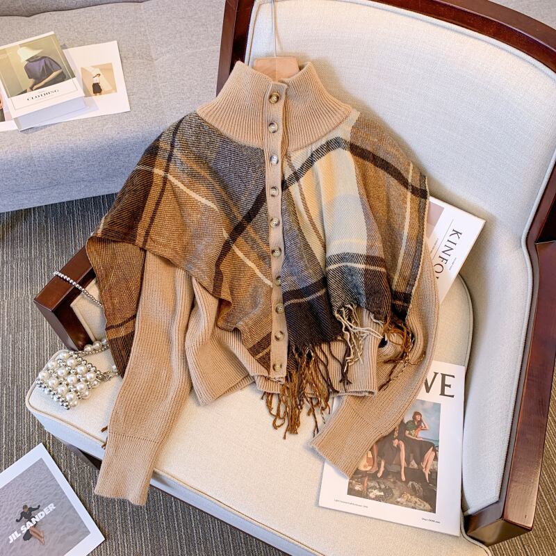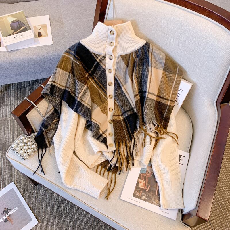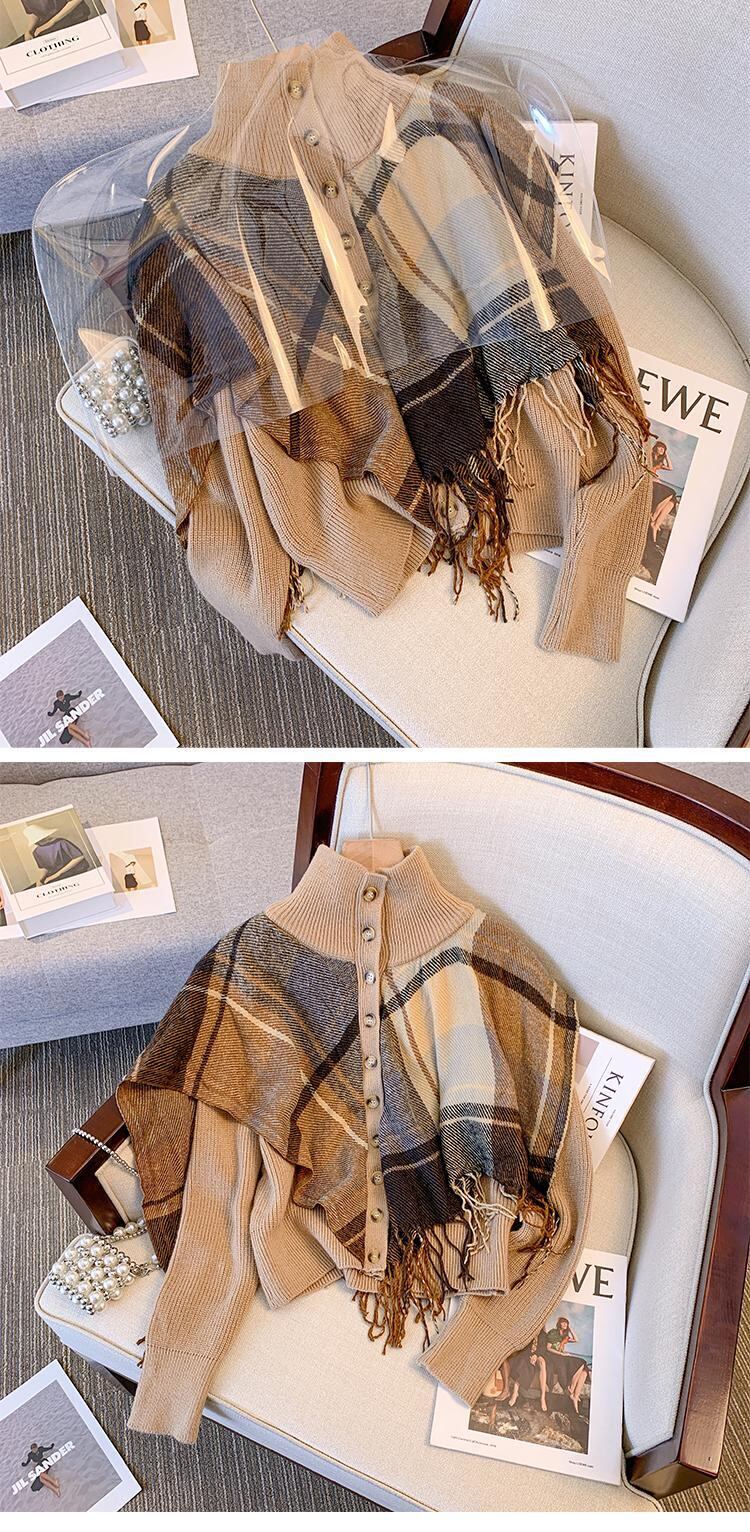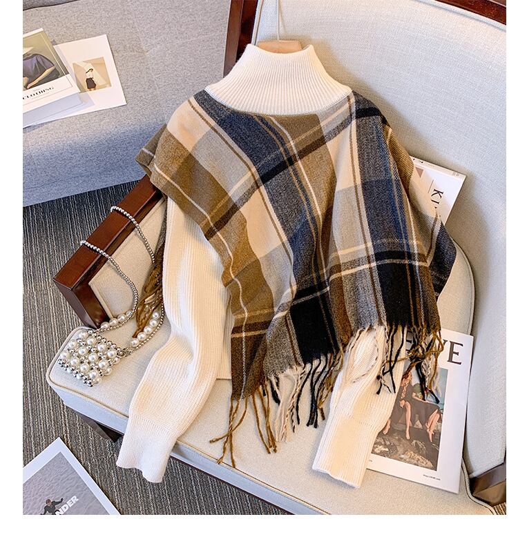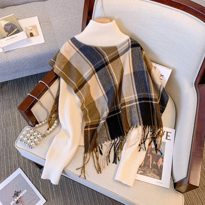 プラスサイズの婦人服 2023 脂肪姉妹春の新チェック柄フリンジショール偽二枚高襟肥厚セーター女性 大きめサイズ スプリング 春物 8884164234068059