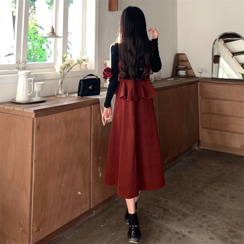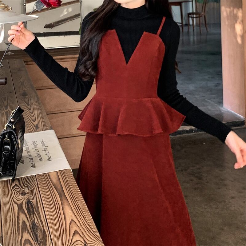 プラスサイズの婦人服 2023 トレンディな女性の春の新しい太った姉妹フランスのレトロなドレス長袖ボトムシャツ 2 点セット ロング 大きめサイズ スプリング 春物 8884171478022746