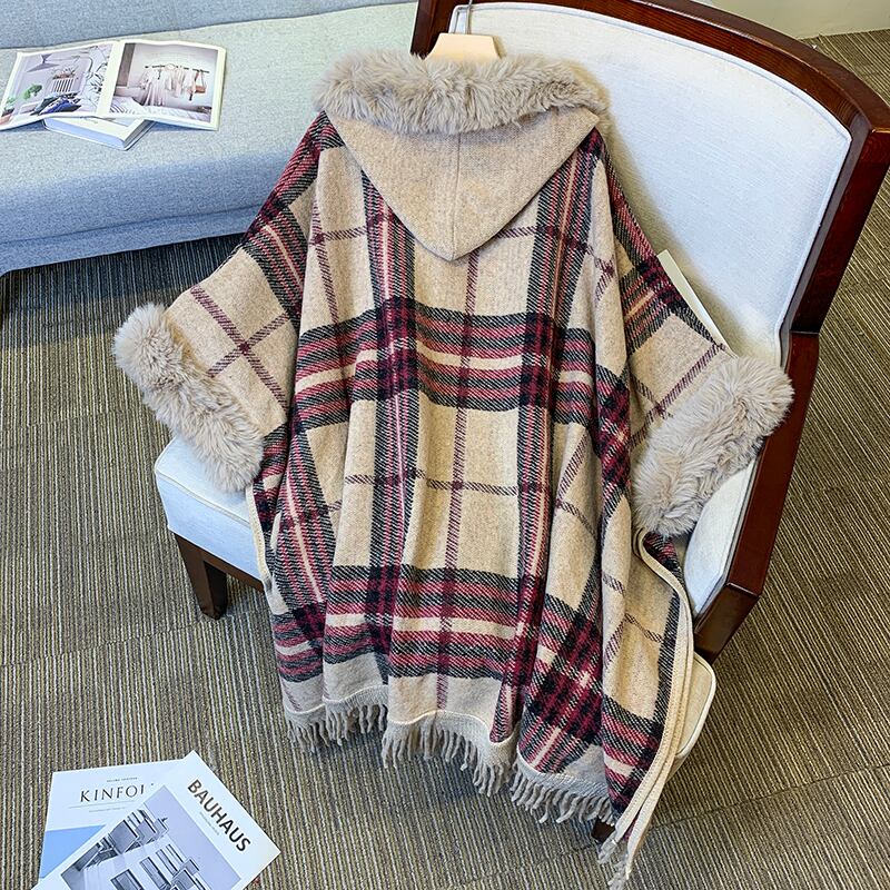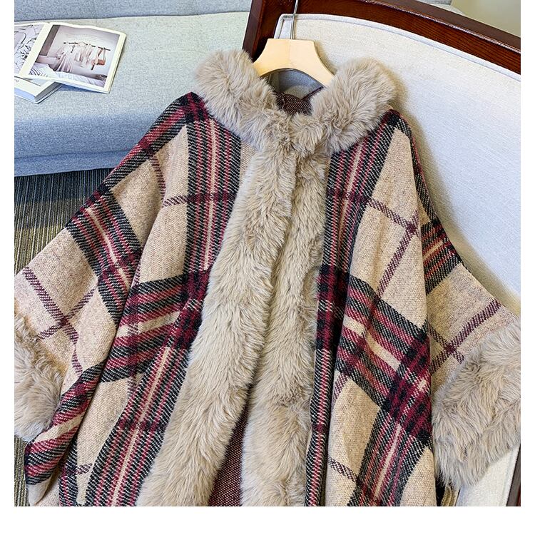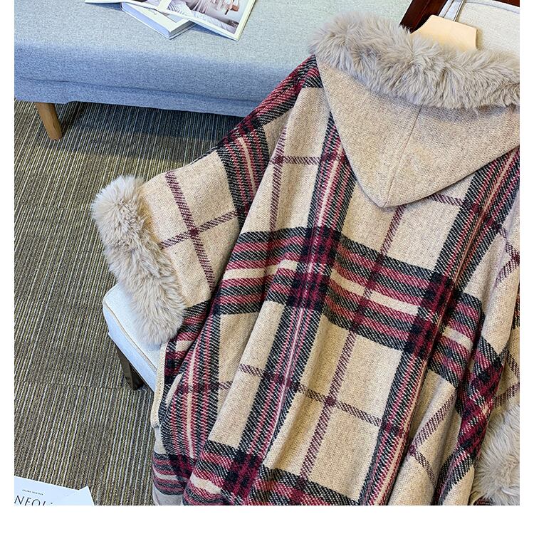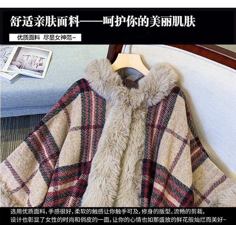 プラスサイズの婦人服 2023 脂肪姉妹春の新しいフード付き豪華なケープショール毛皮の襟の格子縞のマントコート 大きめサイズ スプリング 春物 8884150057557097