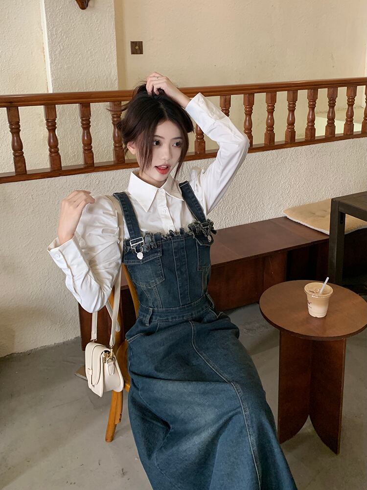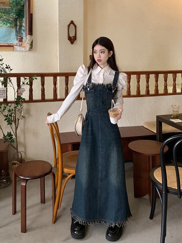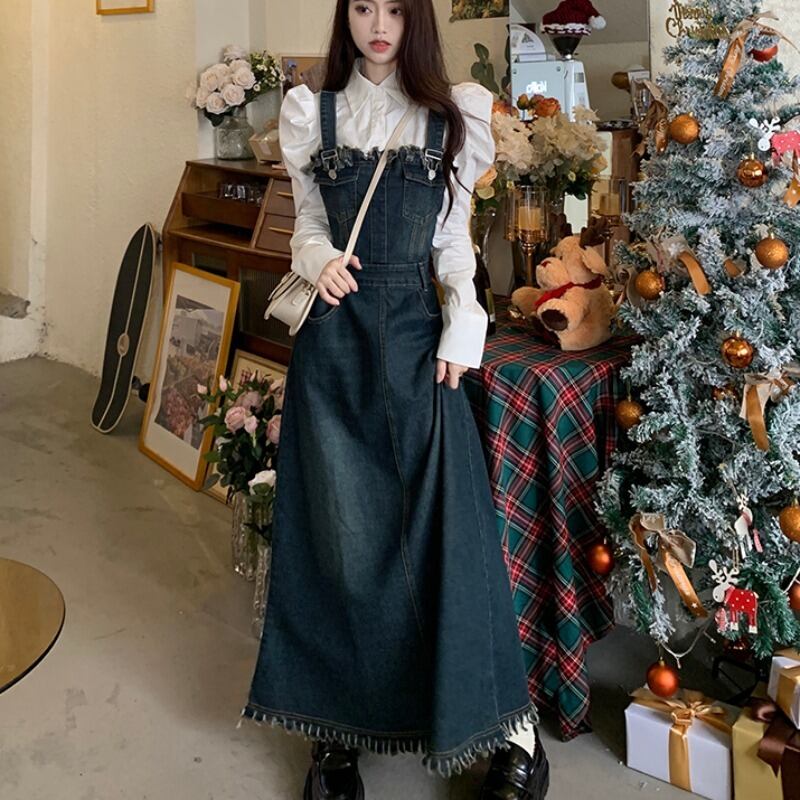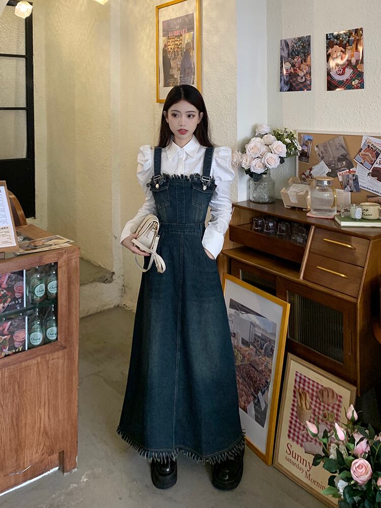 プラスサイズの婦人服 2023 トレンディな女性の春の新しいファットシスターデニムストラップドレスパフスリーブシャツツーピーススーツ 大きめサイズ スプリング 春物 8884140990251993