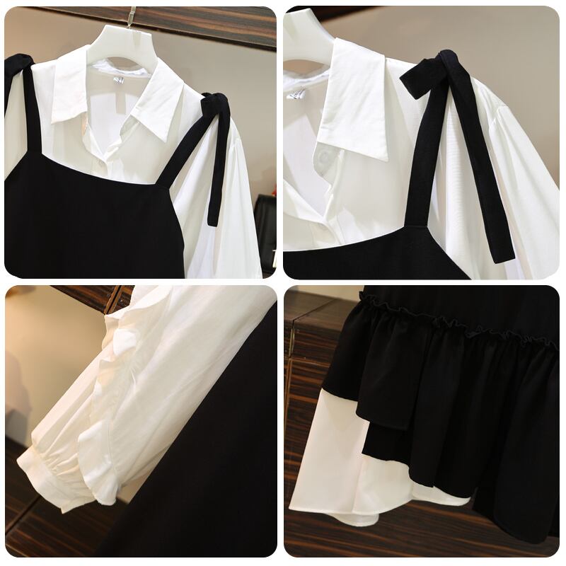 プラスサイズの婦人服 2023 ファットシスター春の新白シャツ年齢減少年齢コントラストステッチサスペンダースカートツーピーススーツ ホワイト 大きめサイズ スプリング 春物 8884159846587565