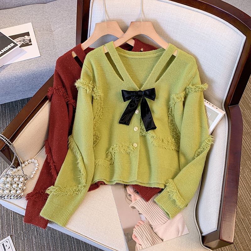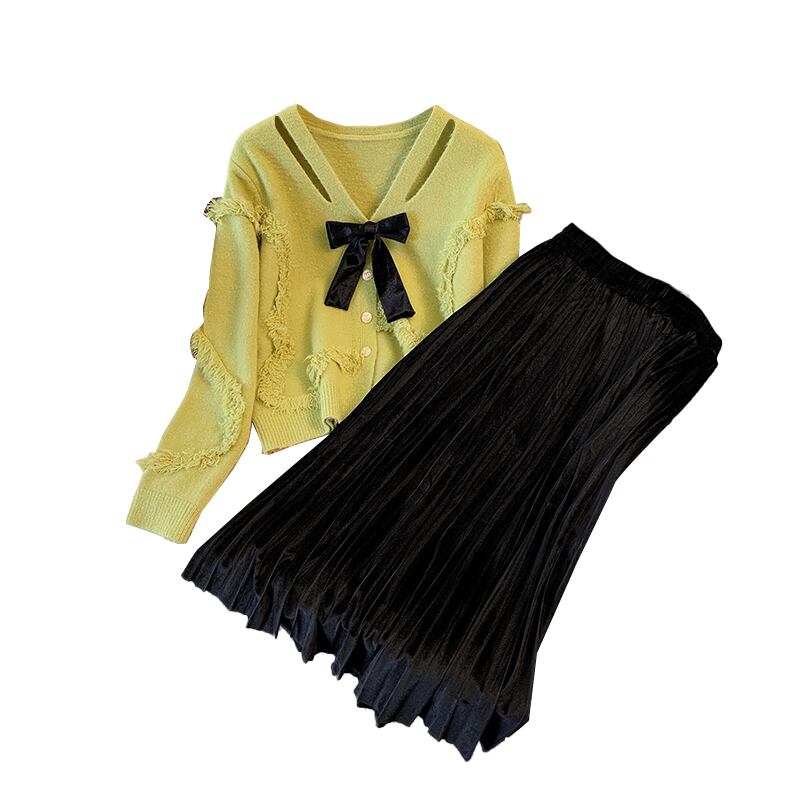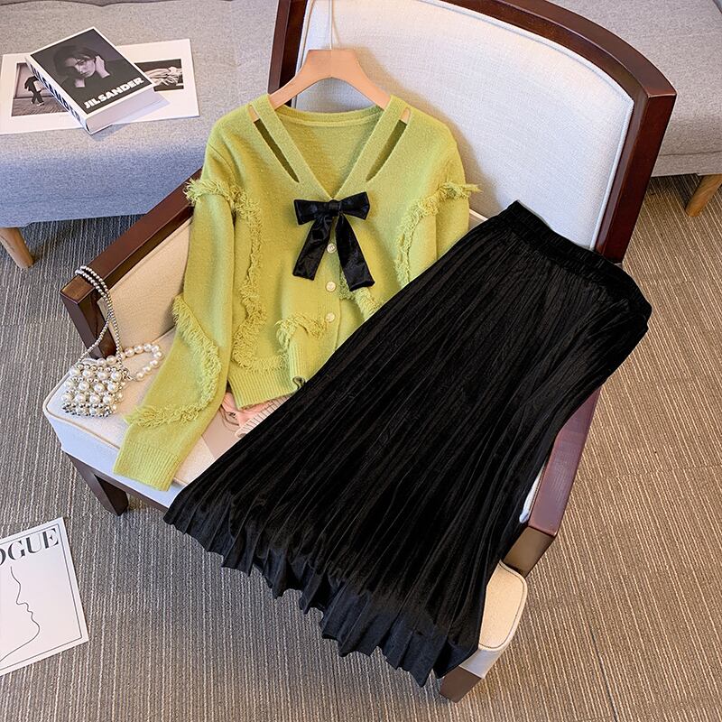 プラスサイズの婦人服 2023 ファットシスター春の新 V ネックちょう結びニットセーターの女性のプリーツスカート 2 点セット リボン 大きめサイズ スプリング 春物 Vネック 8884159722116556