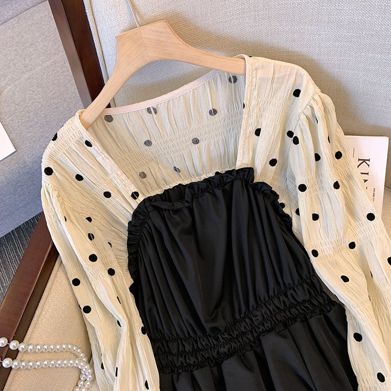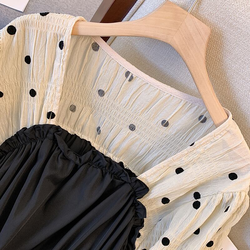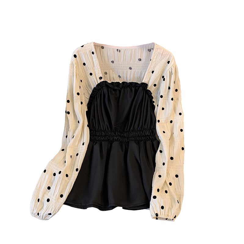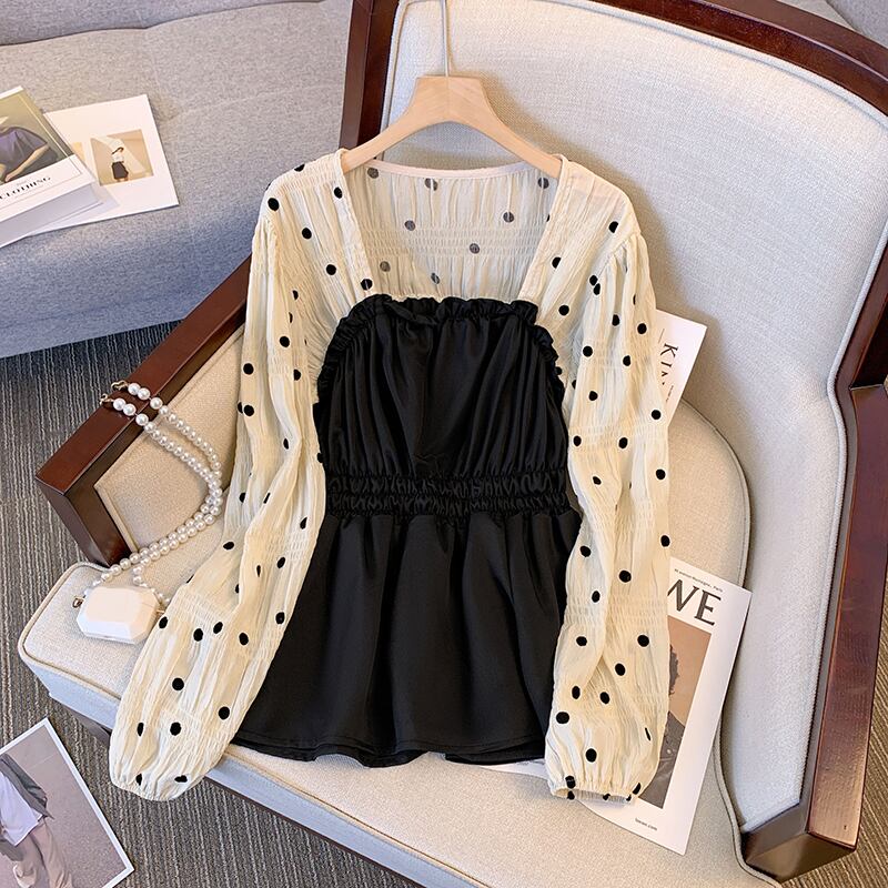 プラスサイズの婦人服 2023 春の新しいスタイルの太った姉妹の気質のフェイクツーピース水玉シフォンウエストカバー肉削減トップ 大きめサイズ スプリング 春物 8884136314855460
