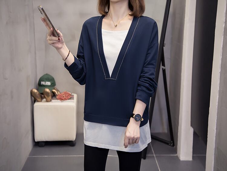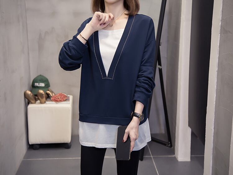 大きいサイズの婦人服 2023 春の新しいスタイルの太った姉妹ファッション コントラスト カラー スプライシング偽ツーピース デザイン長袖セーター ロング 大きめサイズ スプリング 春物 8884118755336324