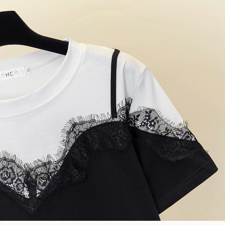 プラスサイズの婦人服 2023 夏の新しい太った姉妹スタイルの気質緩いフェイク ツーピース レース ステッチ Tシャツ女性 大きめサイズ サマー 夏物 8884148195392355