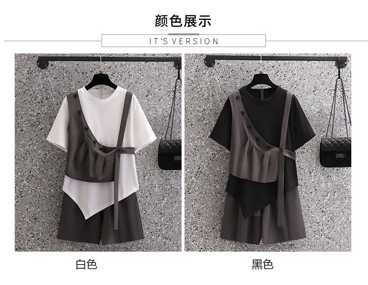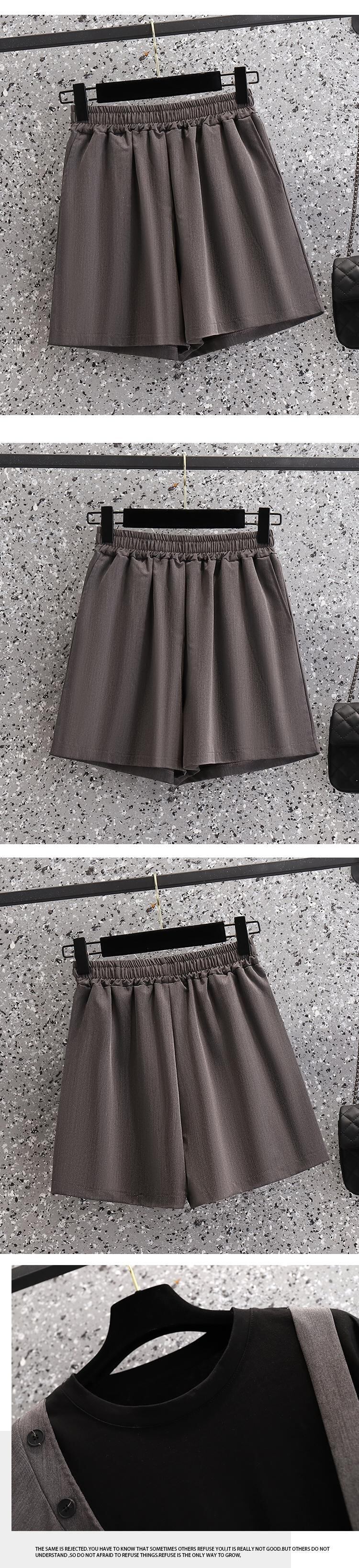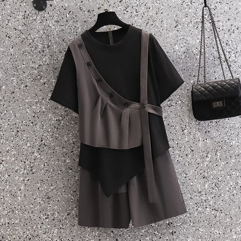 プラスサイズの婦人服 2023 ファットシスター夏の新しいカジュアルなスタイルの半袖トップワイドレッグショーツツーピーススーツ 大きめサイズ サマー 夏物 ブルマー 8884140916075304