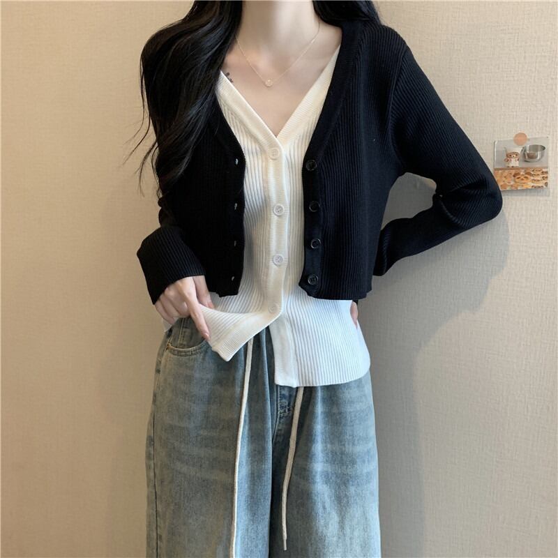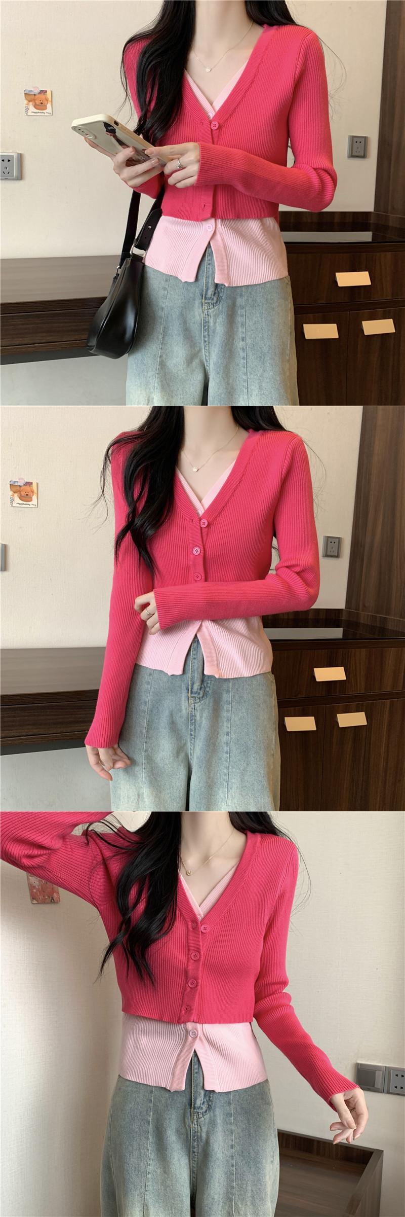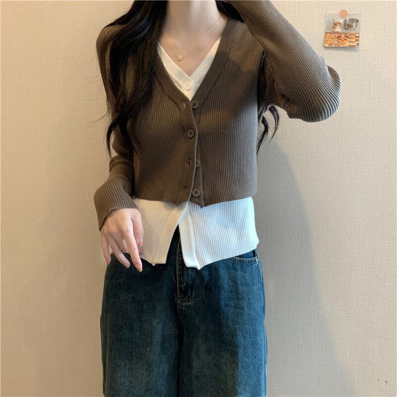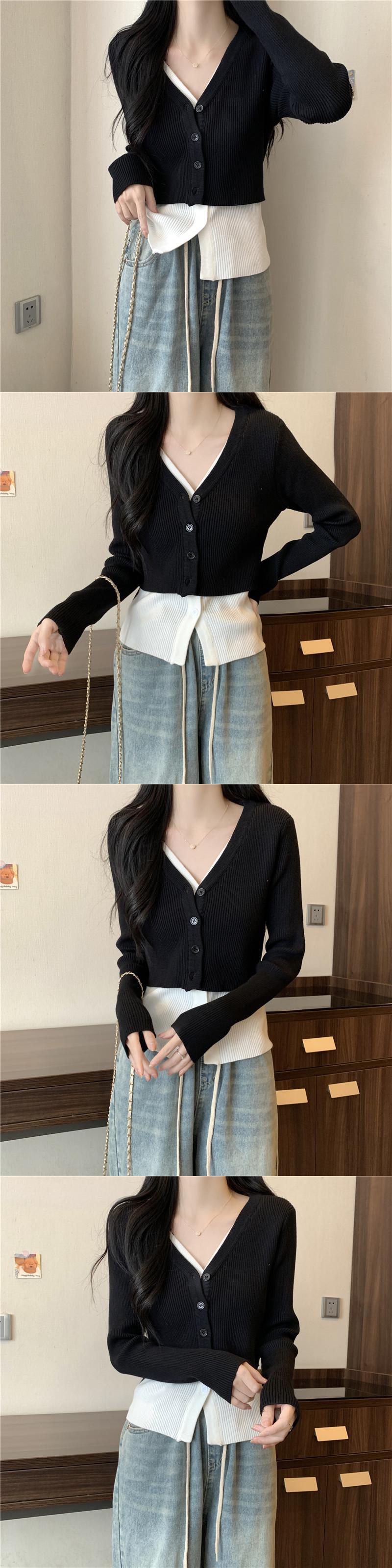 大きいサイズの婦人服 2023 トレンディな女性の春の新しいスタイルの太った姉妹のファッションの偽のツーピースのコントラストカラーの薄いステッチの長袖のニットのセーター ロング 大きめサイズ スプリング 春物 8884160483955150