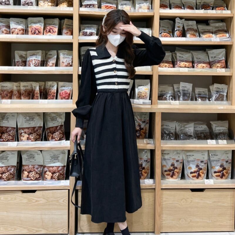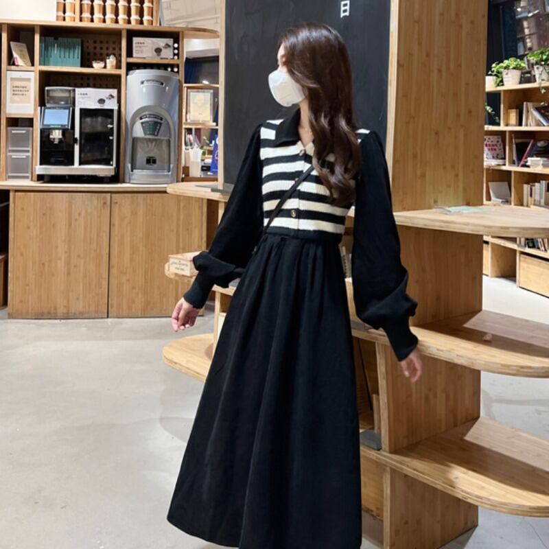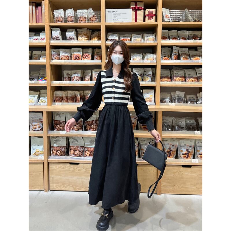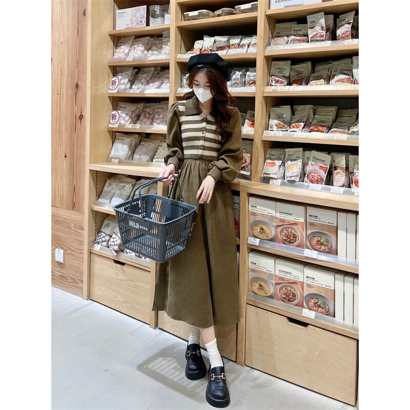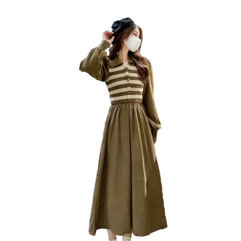 プラスサイズの婦人服 2023 脂肪姉妹春の新しいストライプニットステッチコーデュロイ偽ツーピースドレス女性 大きめサイズ スプリング 春物 8884128003863532