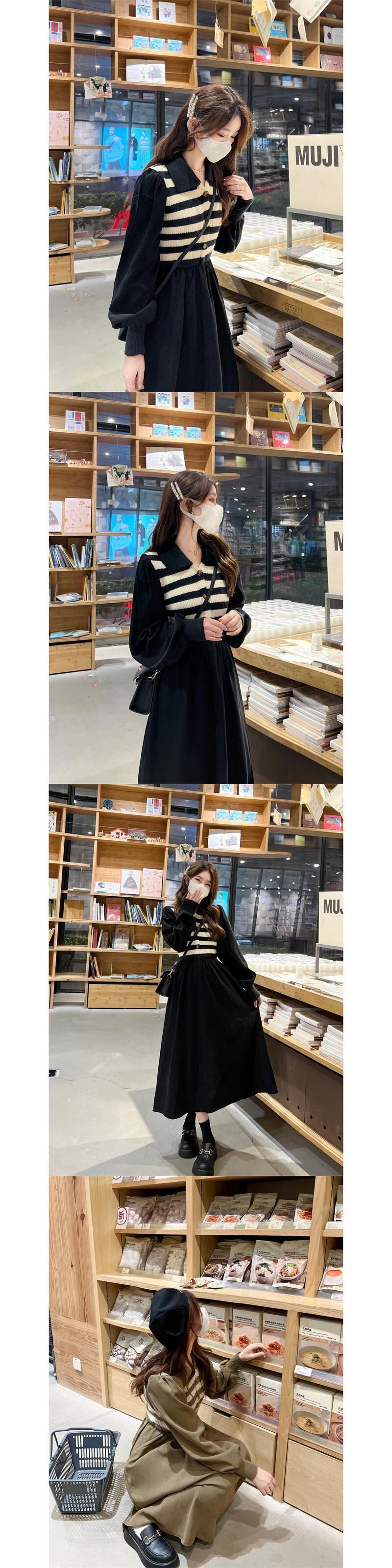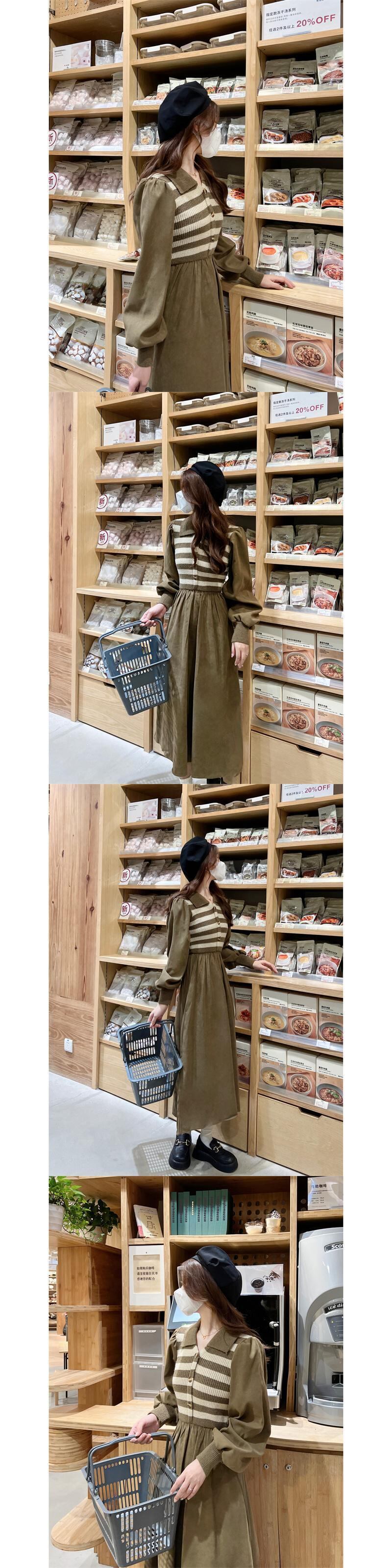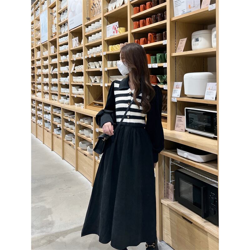 プラスサイズの婦人服 2023 脂肪姉妹春の新しいストライプニットステッチコーデュロイ偽ツーピースドレス女性 大きめサイズ スプリング 春物 8884128003863532