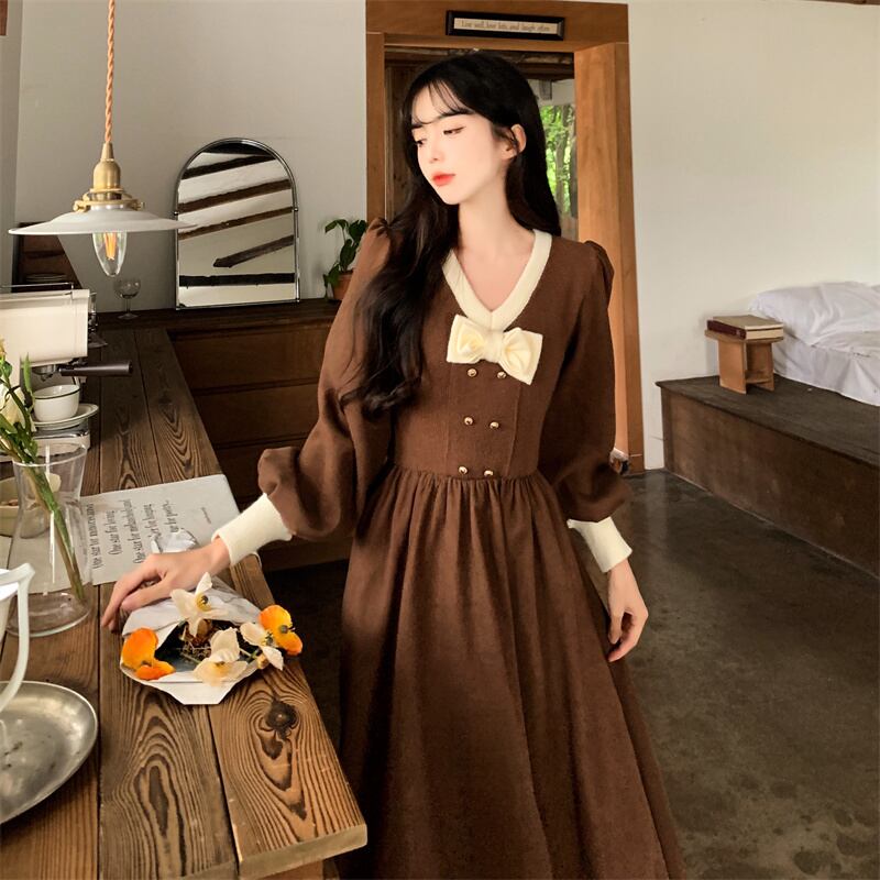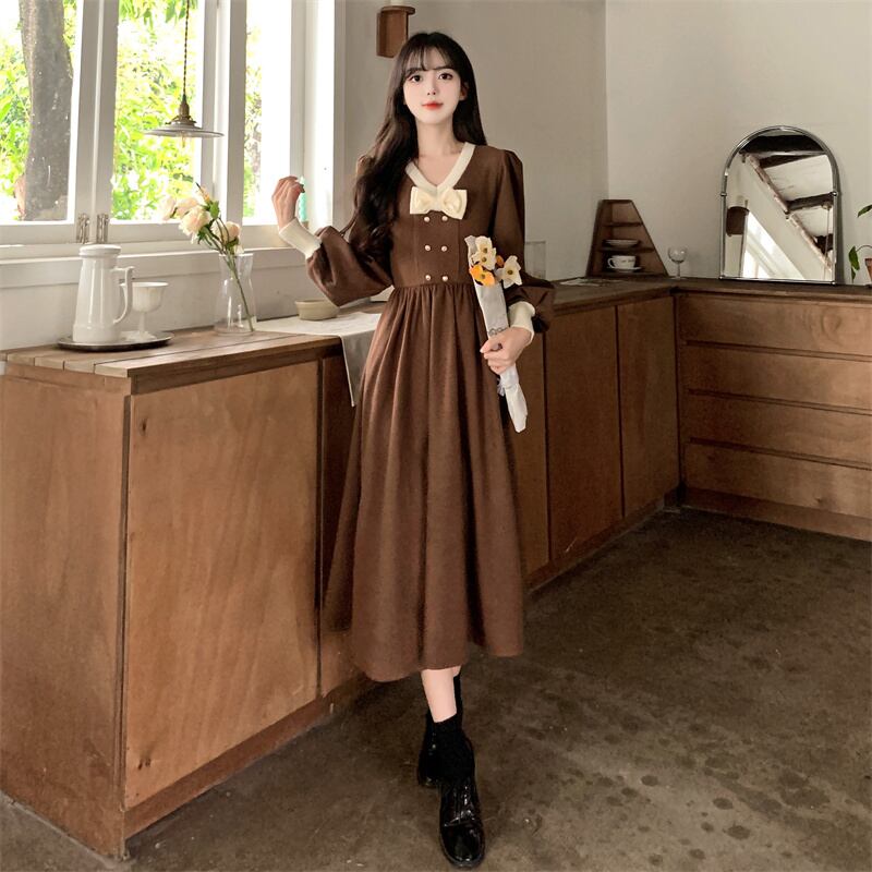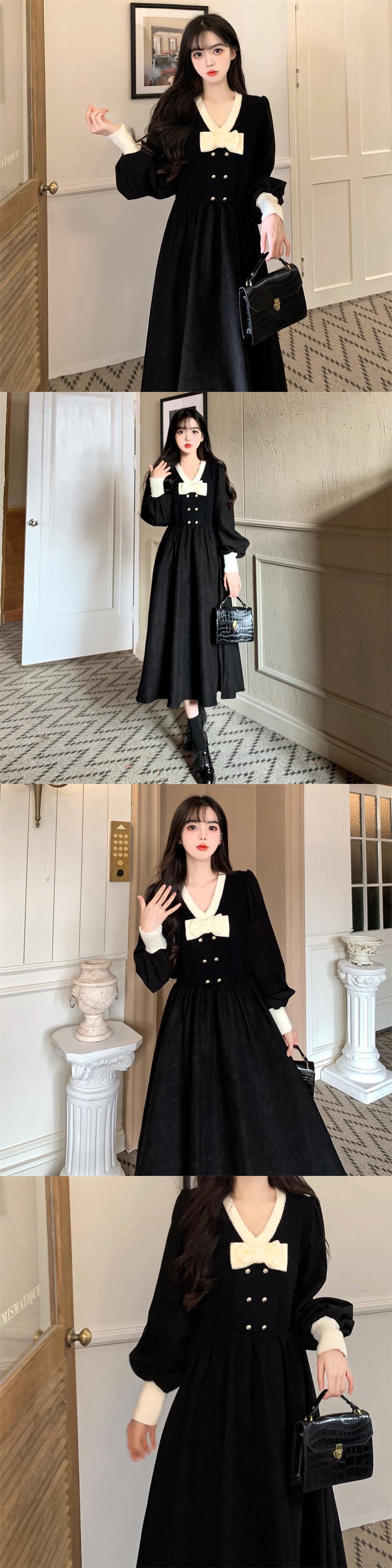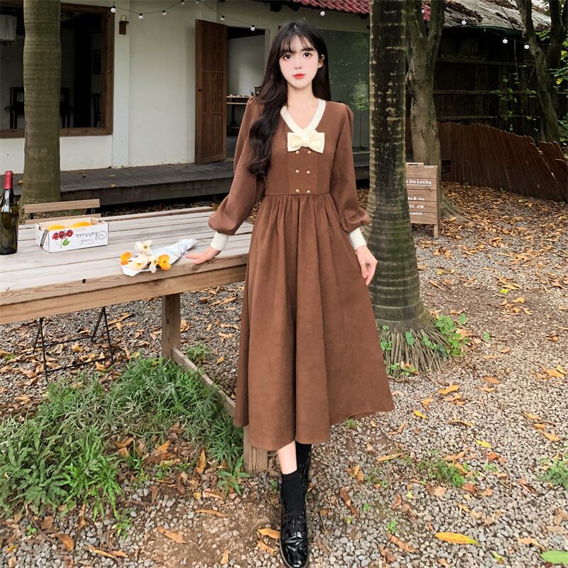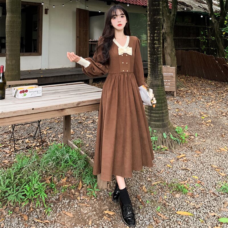 プラスサイズの婦人服 2023 ファットシスター春の新 V ネックちょうニットステッチコーデュロイドレス女性 リボン 大きめサイズ スプリング 春物 Vネック 8884154518552345