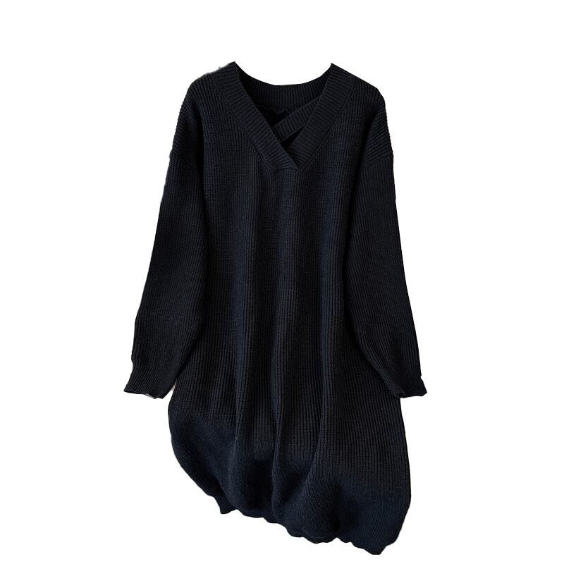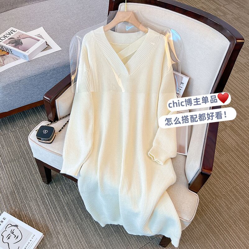 プラスサイズの婦人服 2023 ファットシスター春の新ファッション V ネック無地痩身ミッドレングスセータードレス 大きめサイズ スプリング 春物 Vネック ソリッドカラー 8884130498196597