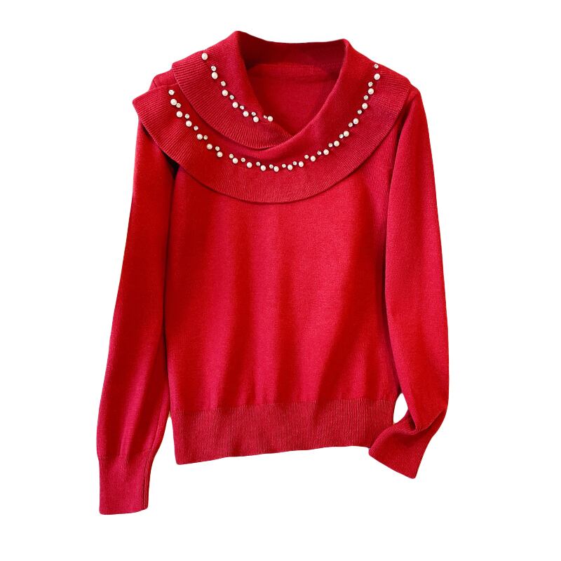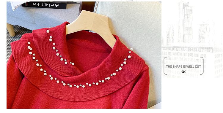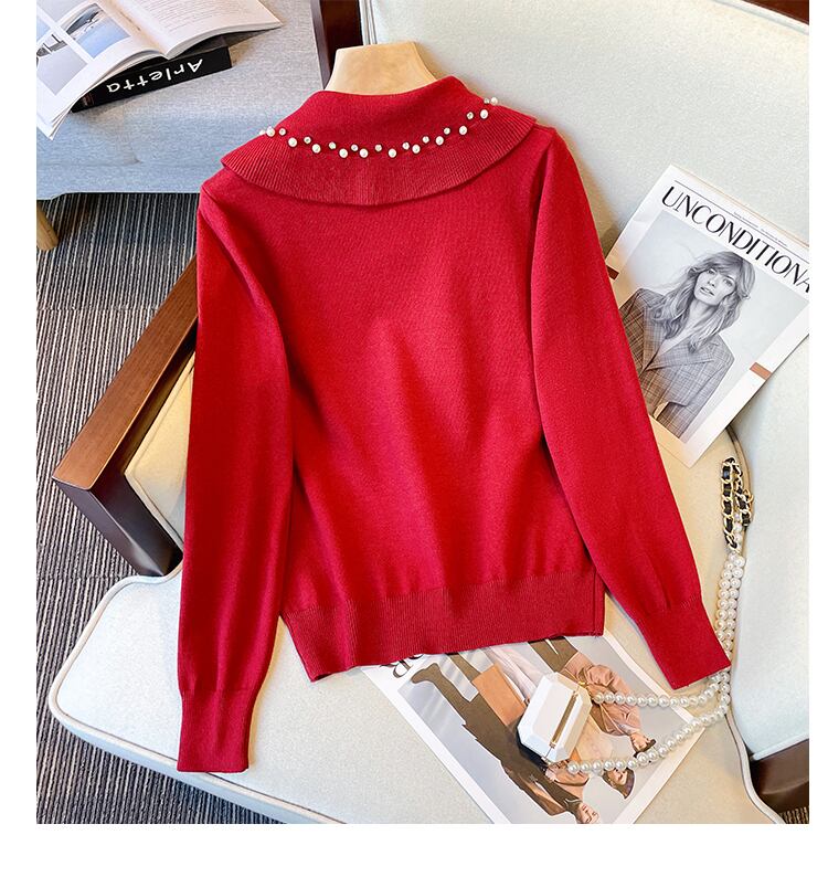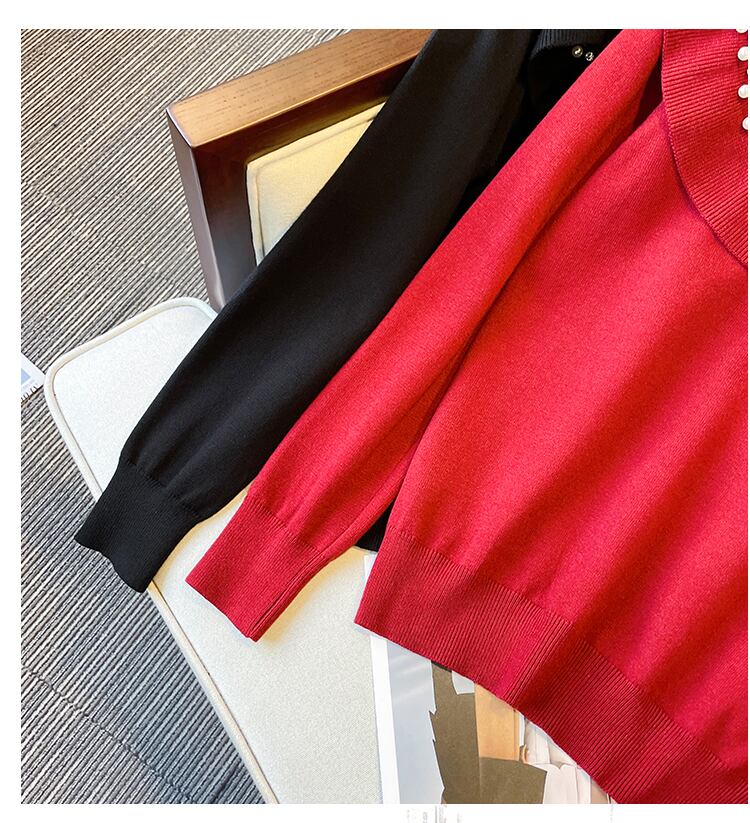 プラスサイズの婦人服 2023 ファットシスター春の新ニットトッププリーツカラーネイルビーズカバーベリースリムセーター女性 大きめサイズ スプリング 春物 8884157945079769