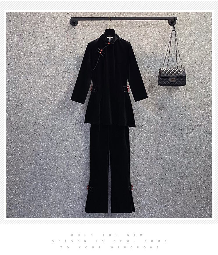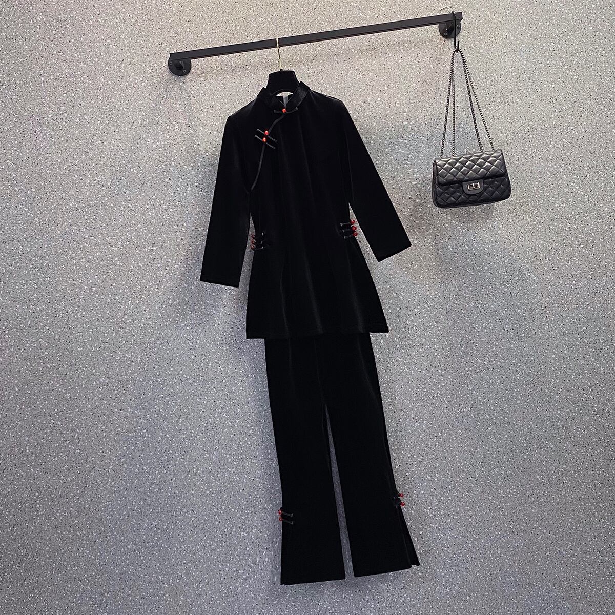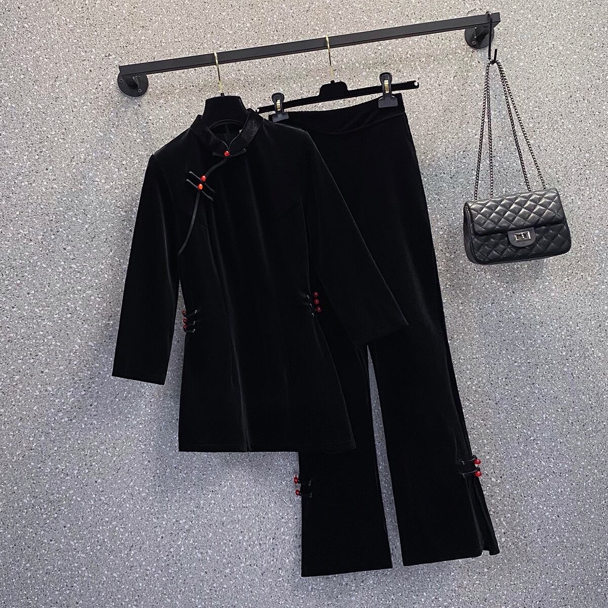 プラスサイズの婦人服 2023 脂肪姉妹春の新しいレトロなチャイナ ドレス韓服バックル トップ ゴールド ベルベット 2 点セット 大きめサイズ スプリング 春物 8884120610743942