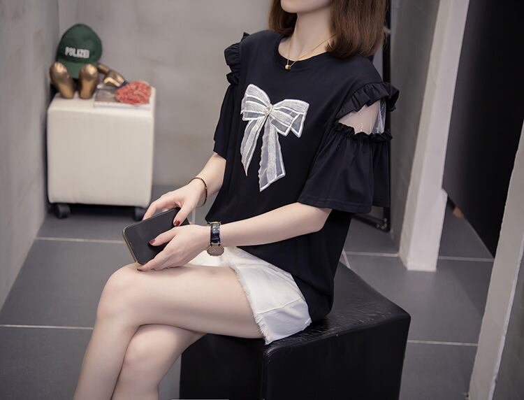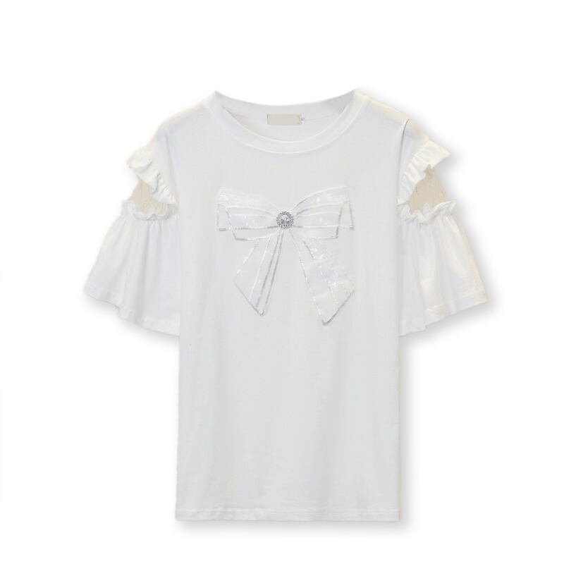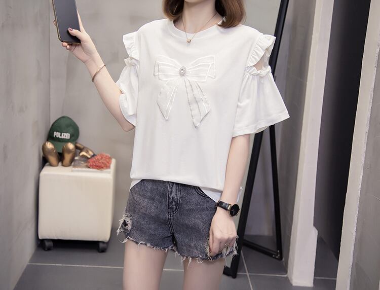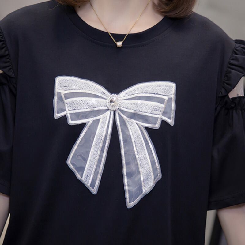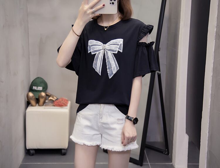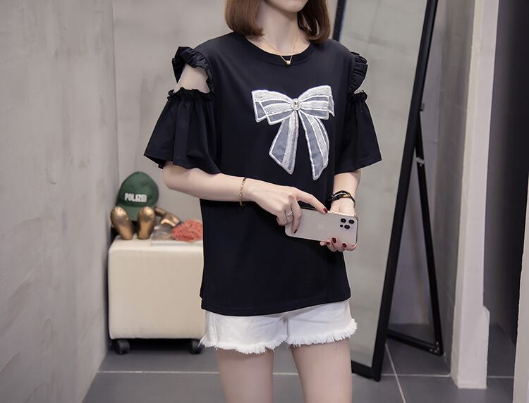 大きいサイズの婦人服 2023 夏の新しいファット シスター デザイン センス オフショルダー ボウ シックでシックな腹を覆う Tシャツ リボン 大きめサイズ サマー 夏物 8884166262177836