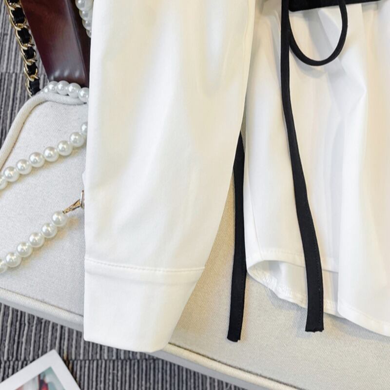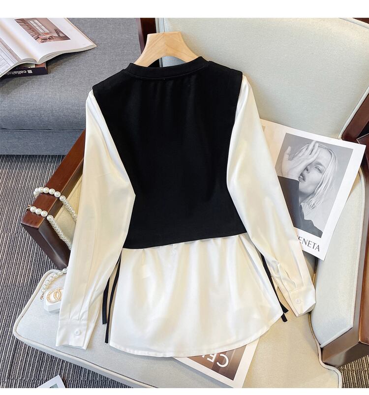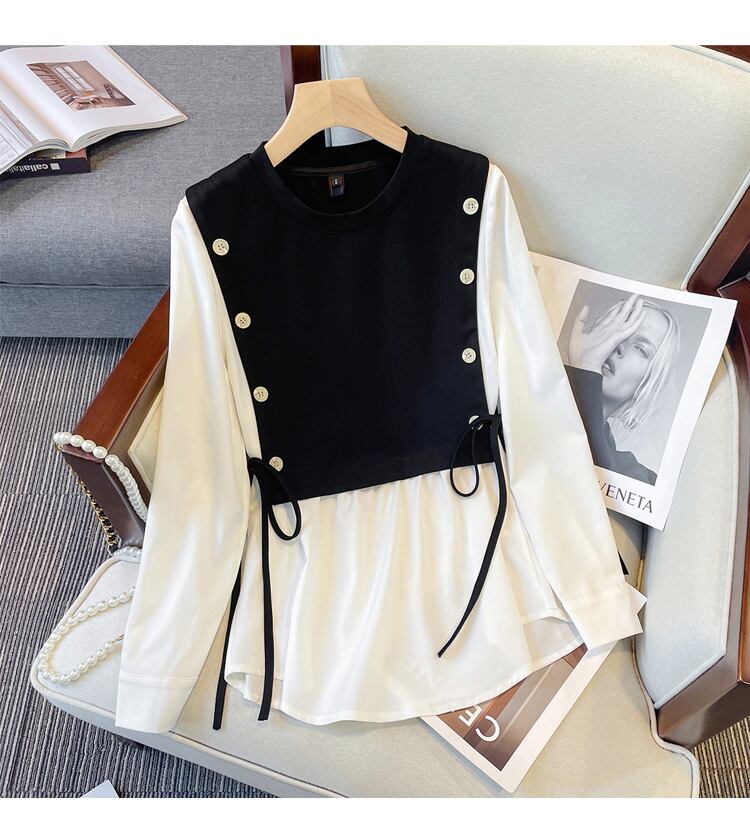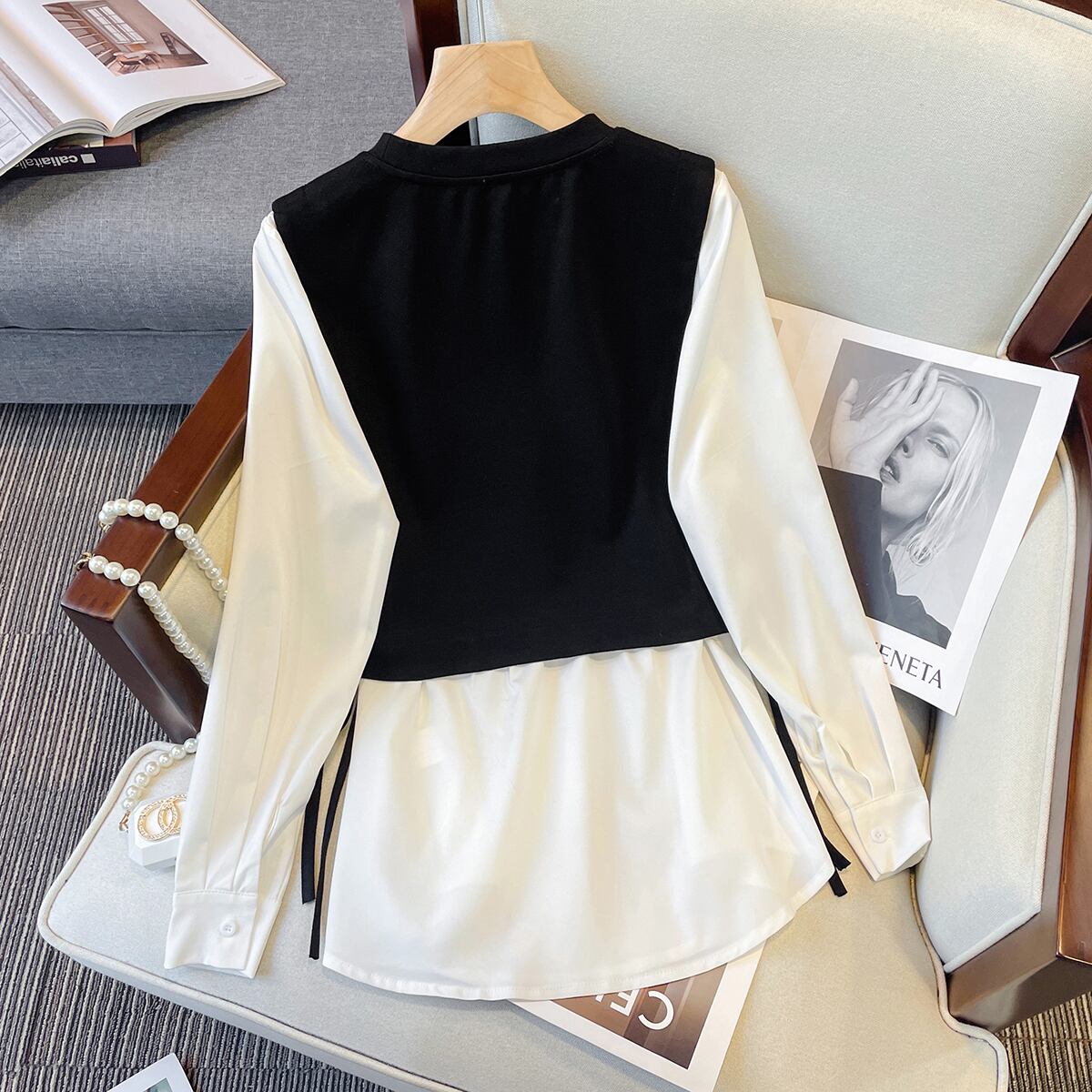 プラスサイズの婦人服 2023 春の新しい太った姉妹のデザイン感 eign と薄いフェイク ツーピース スプライシング長袖シャツ女性 ロング 大きめサイズ スプリング 春物 8884168969124752
