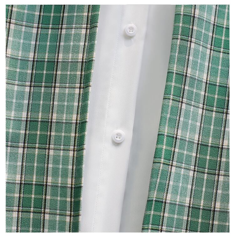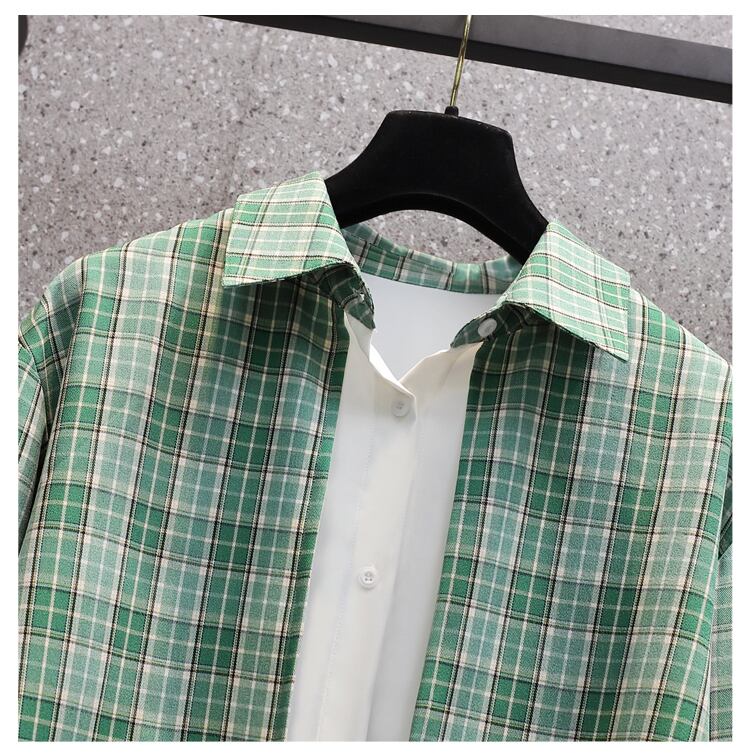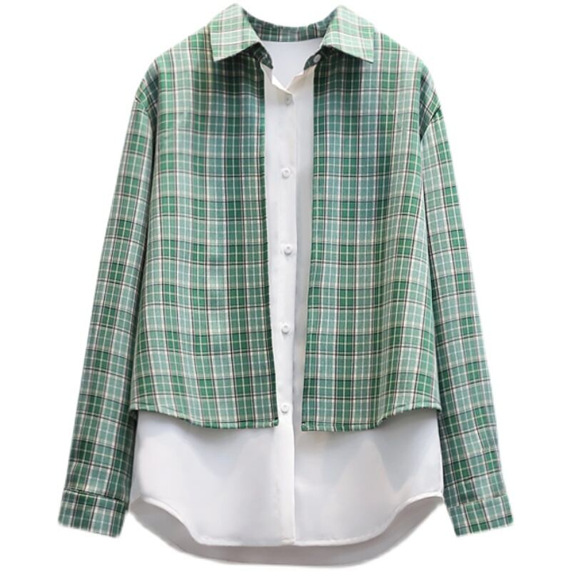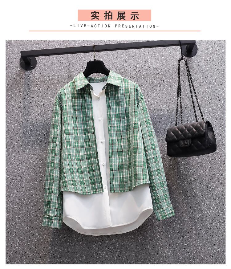 プラスサイズの婦人服 2023 脂肪姉妹春の新ファッション痩身チェック柄スプライシングシャツ偽ツーピーストップ 大きめサイズ スプリング 春物 8884175519394347